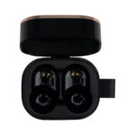 Audífonos auriculares inalámbricos en contenedor de plástico ABS color negro con tapa metálica encobrizada, función Bluetooth Touch ID, puerto Tipo-C, emparejamiento automático, incluye par de protectores de silicona y manual de instrucciones en inglés y español. Presentación en estuche de cartulina KRAFT negra. Producto amigable con el medio ambiente.