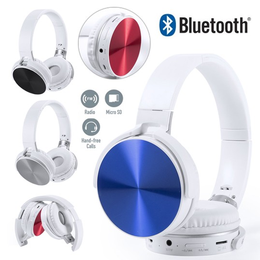 Auriculares plegables de diadema con conexión bluetooth y desenfadado diseño bicolor en variada gama de colores. Con ranura para tarjeta micro SD -tarjeta no incluida-, función manos libres, radio FM, entrada de línea -cable mini jack de 3,5mm incluido- y recargables mediante cable micro USB -incluido-. Protectores de carcasa de aluminio en colores metalizados y cómodas almohadillas en polipiel de color blanco. Presentados en atractiva caja de diseño. Conexión Bluetooth. Conexión Jack 3,5 mm. Recargable USB. Cable Incluido