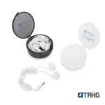 Auriculares con cable en estuche circular. Colores: Blanco y negro. Medidas: 6 x 5,3 x 2 cm.