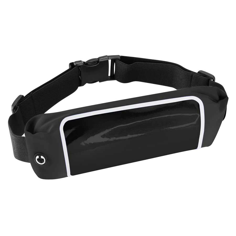 Deluxe Banano impermeable modelo «Jog», en tela Polyester Stretch 210 Waterproof. Incluye banda-cinturón elasticado ajustable color negro, cierre-eclair posterior impermeable, salida para auriculares y ventana de PVC clear para smart-phone, compatible Samsung, i-Phone, Xperia y en general todas las marcas, modelos y tamaños. Bandas reflectantes color plateado en ambos lados. Ideal para practicar deportes.