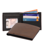 Billetera de eco-cuero color café, modelo «DENVER». Contiene 6 compartimentos interiores. Presentación en bolsa frozen.
