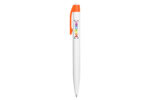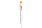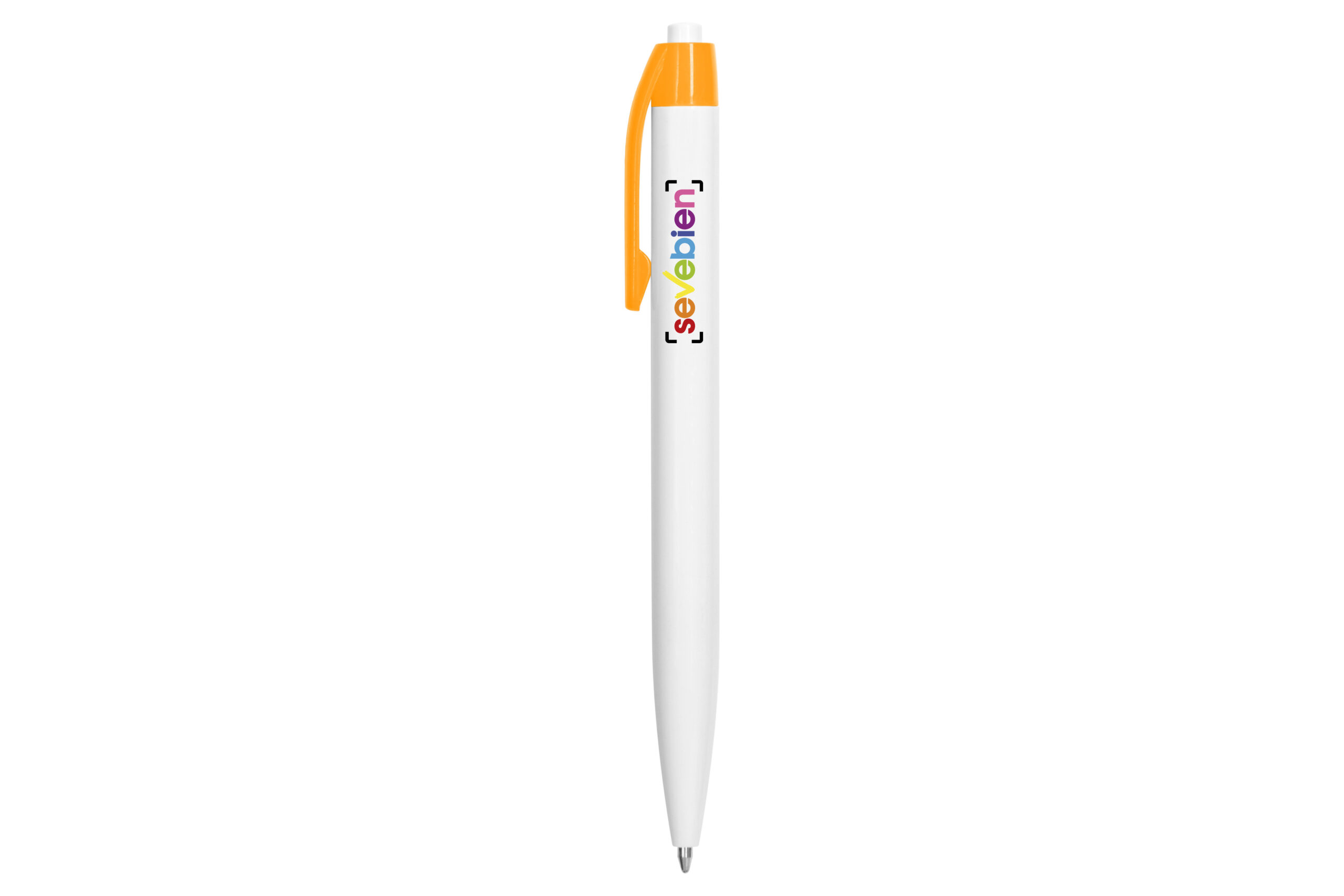 Plástico. Bolígrafo con cuerpo y pulsador de color blanco y clip en color. Tinta negra.