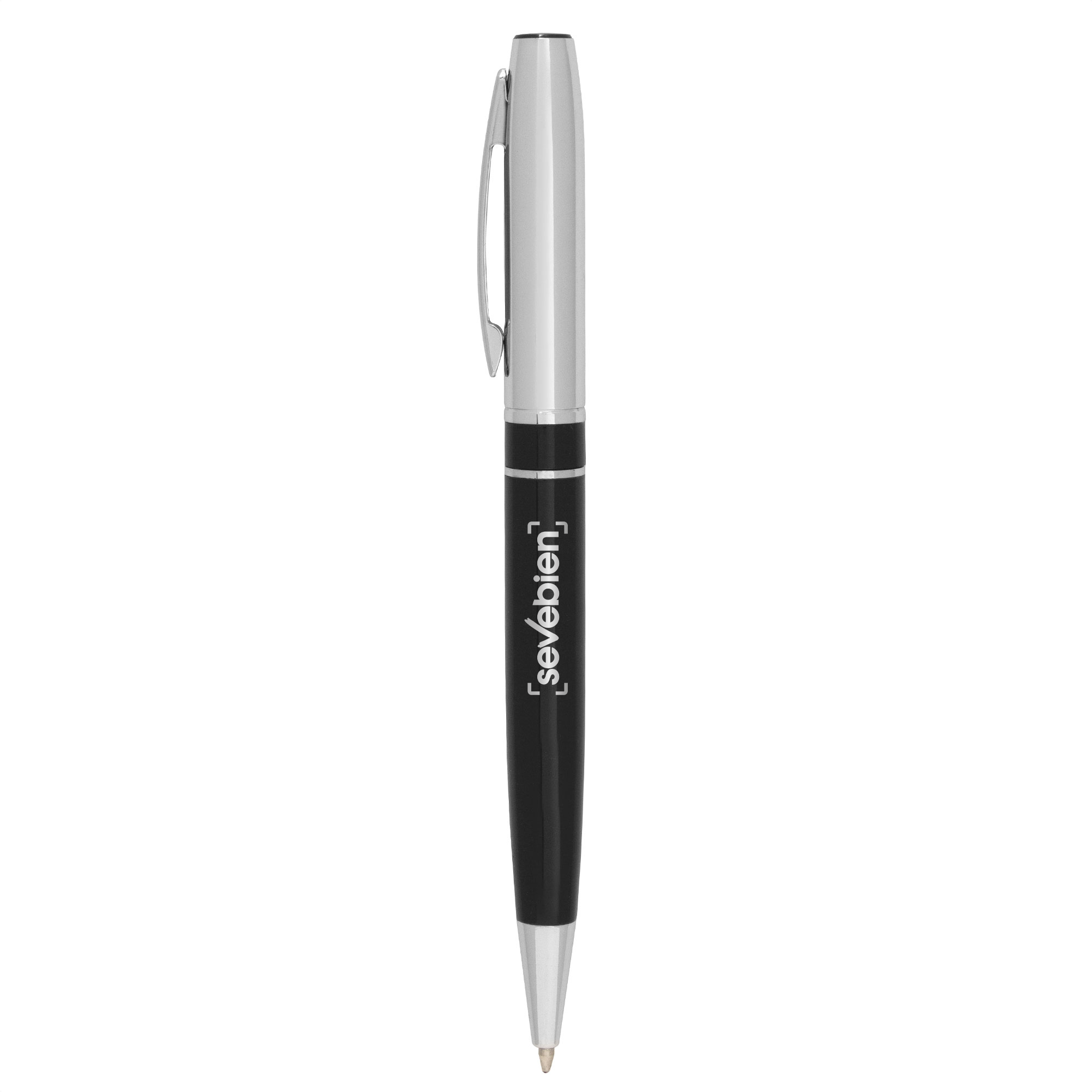 Metálico. Cuerpo color negro. Tambor superior, clip, anillo y puntera color plata. Apertura giratoria. Destape plata en la parte superior e inferior. Tinta azul. Presentación en caja de regalo.