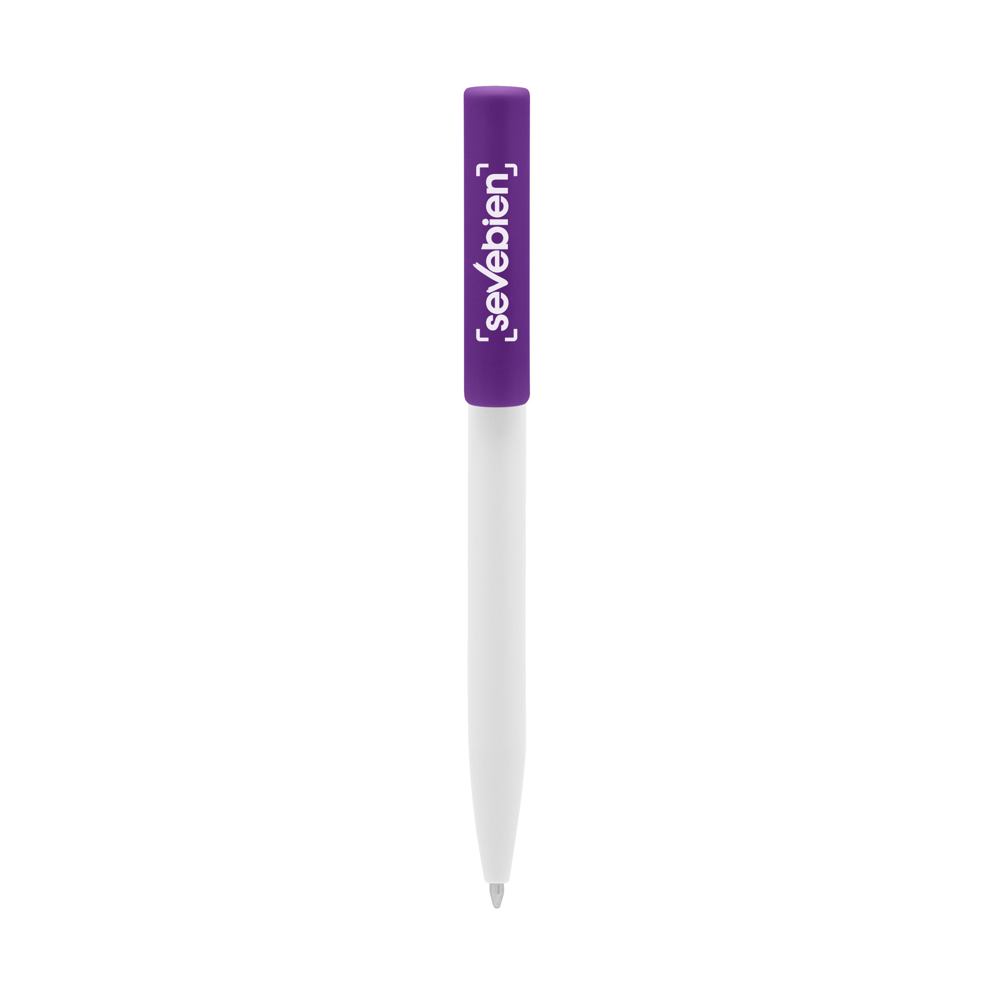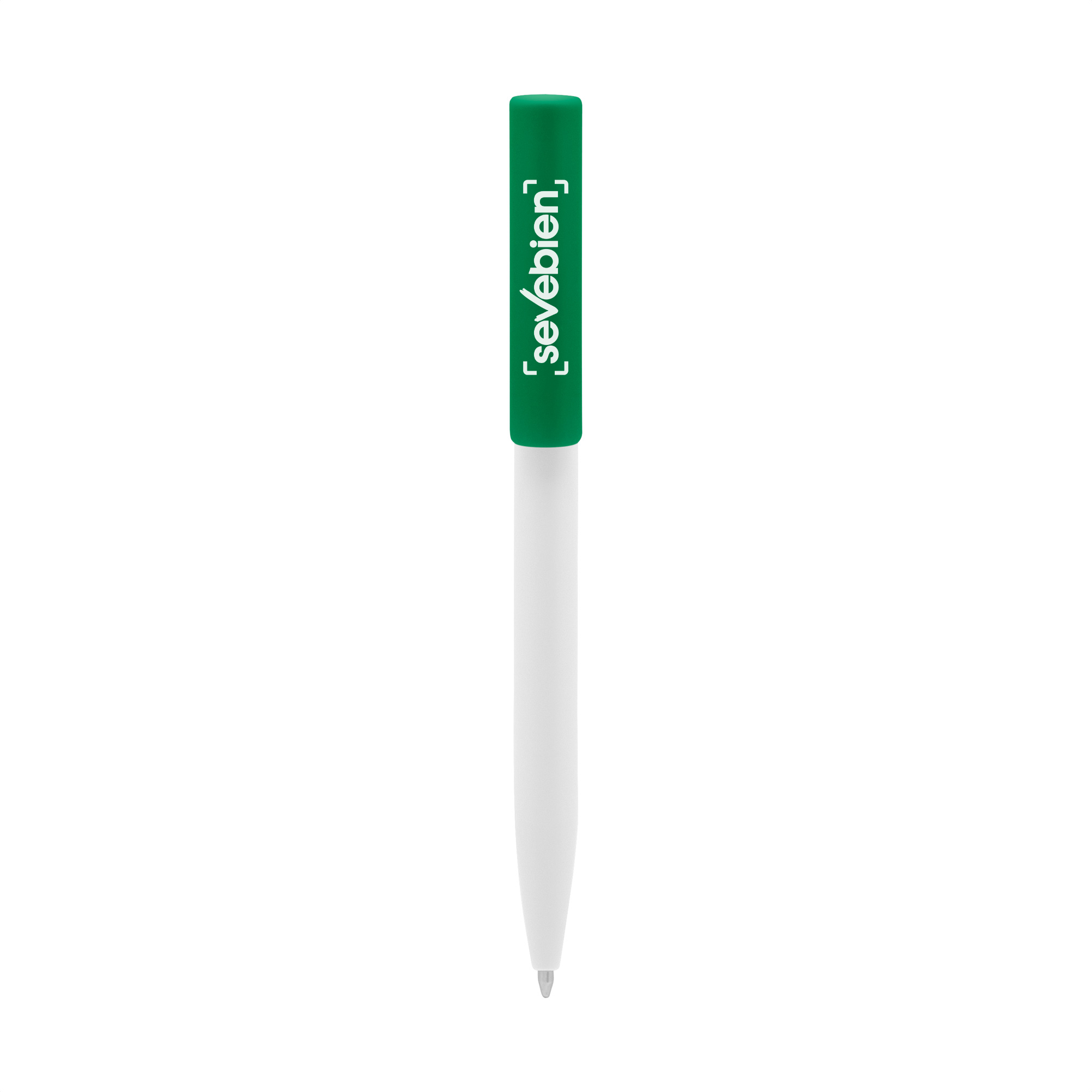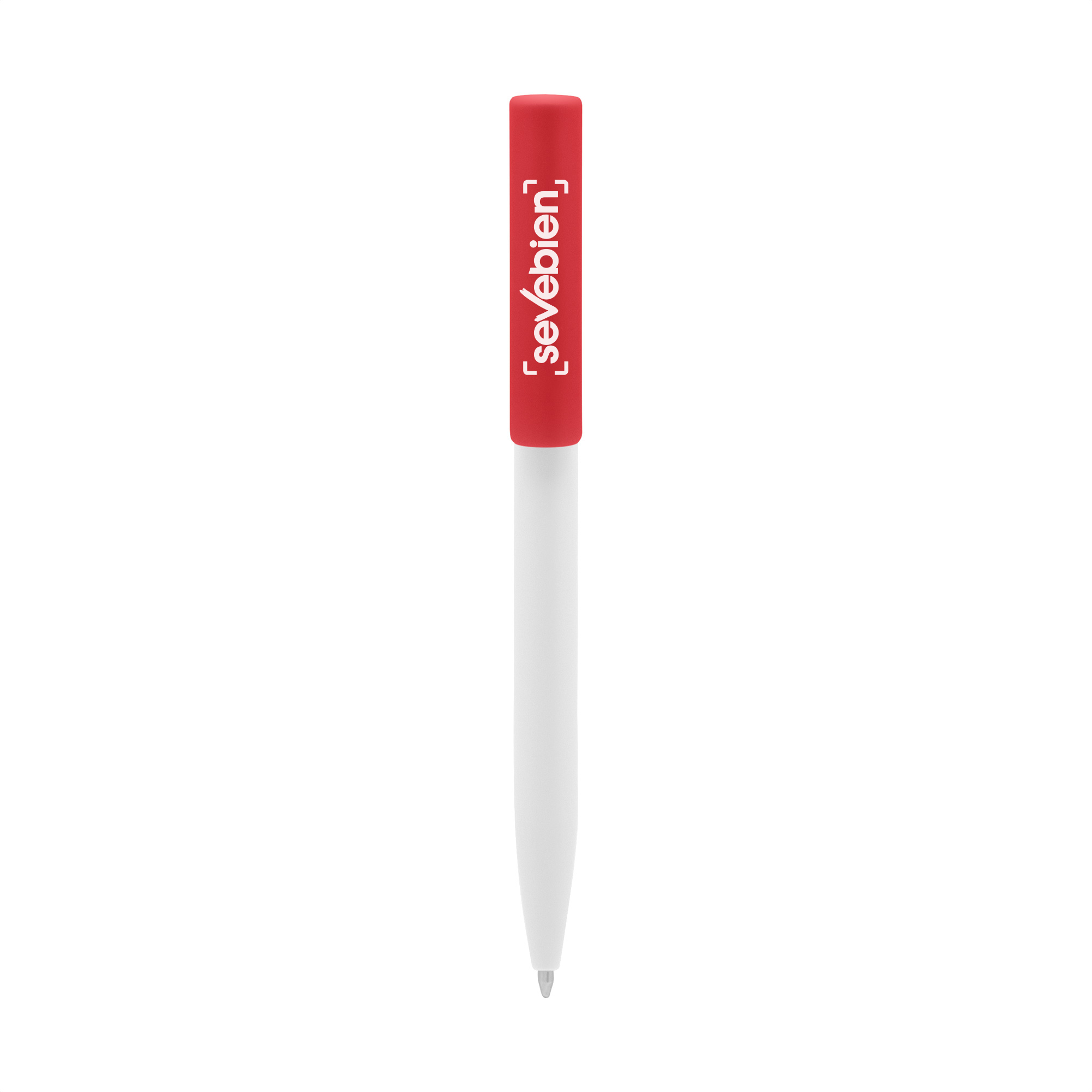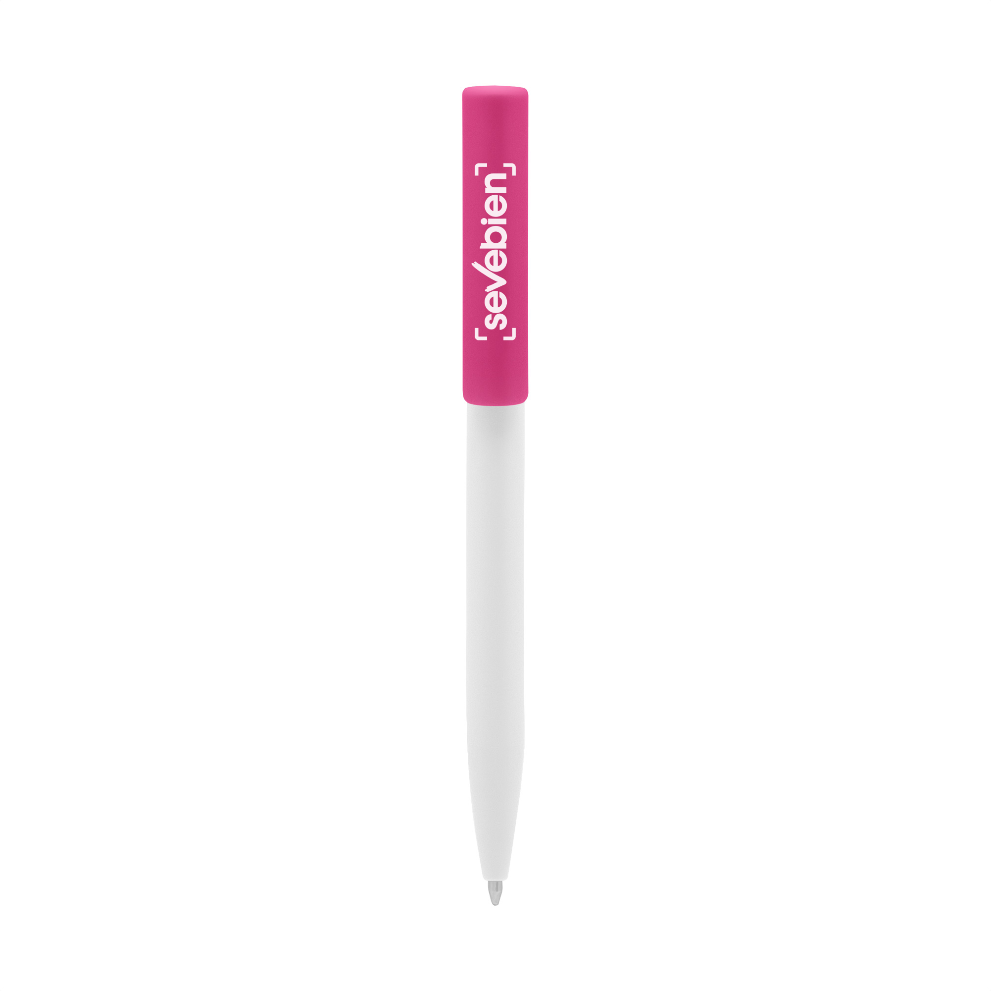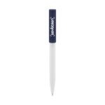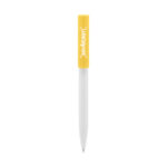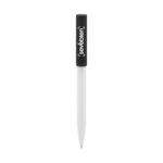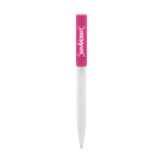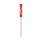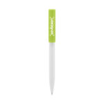 Plástico. Cuerpo blanco y clip de diferentes colores. Bolígrafo retráctil. Clip plástico de colores. Tinta negra. Sistema de botón push para destapar. Amplia área de impresión.
