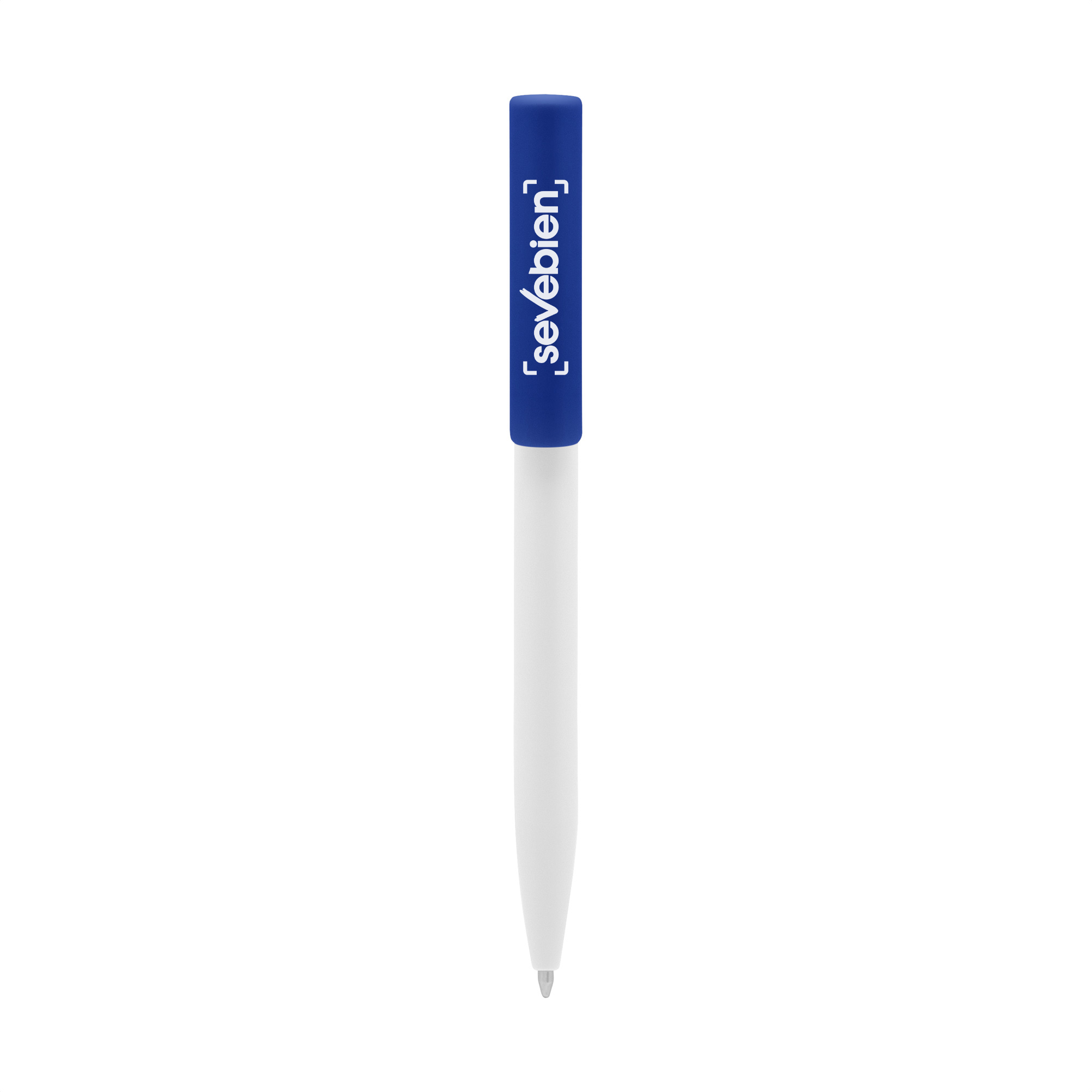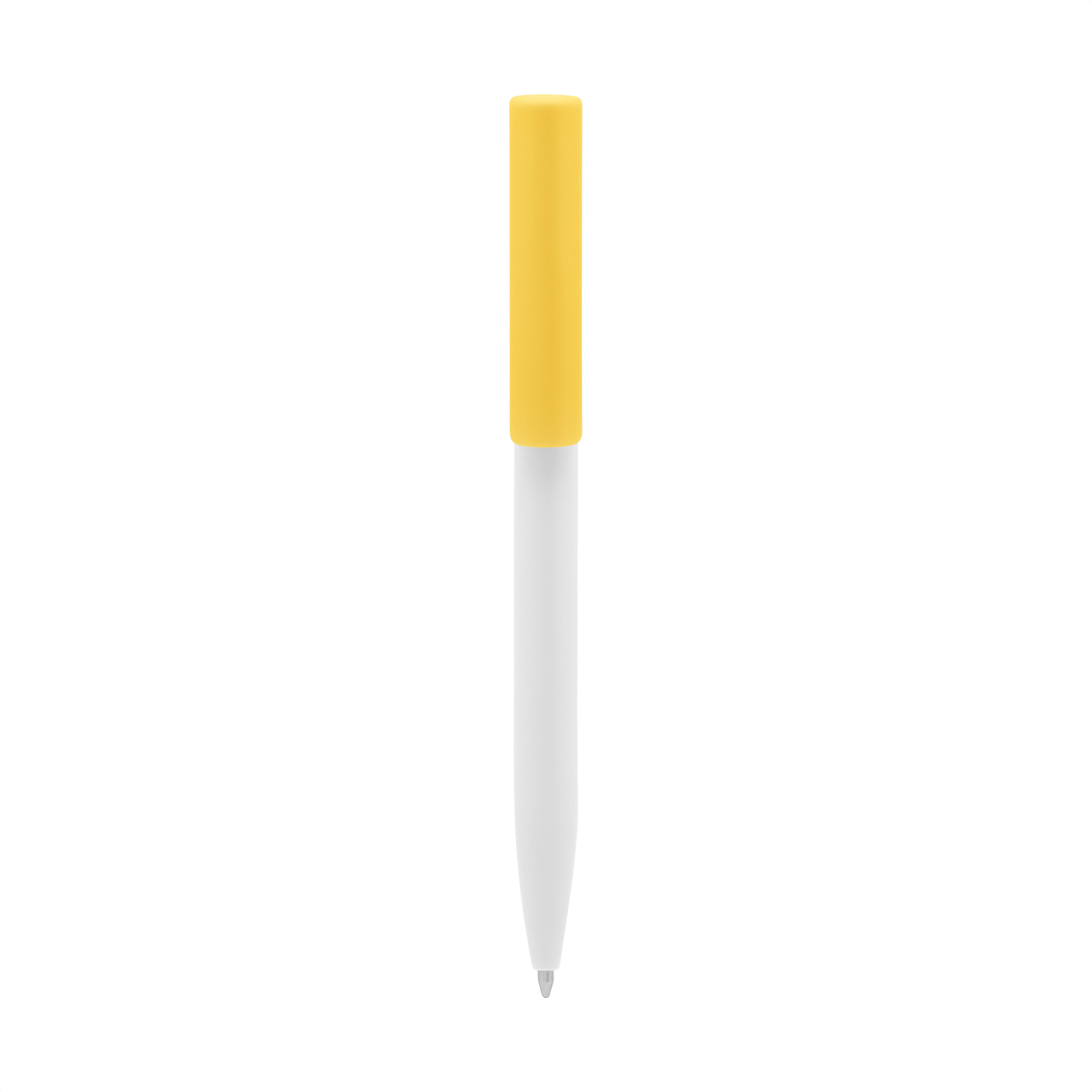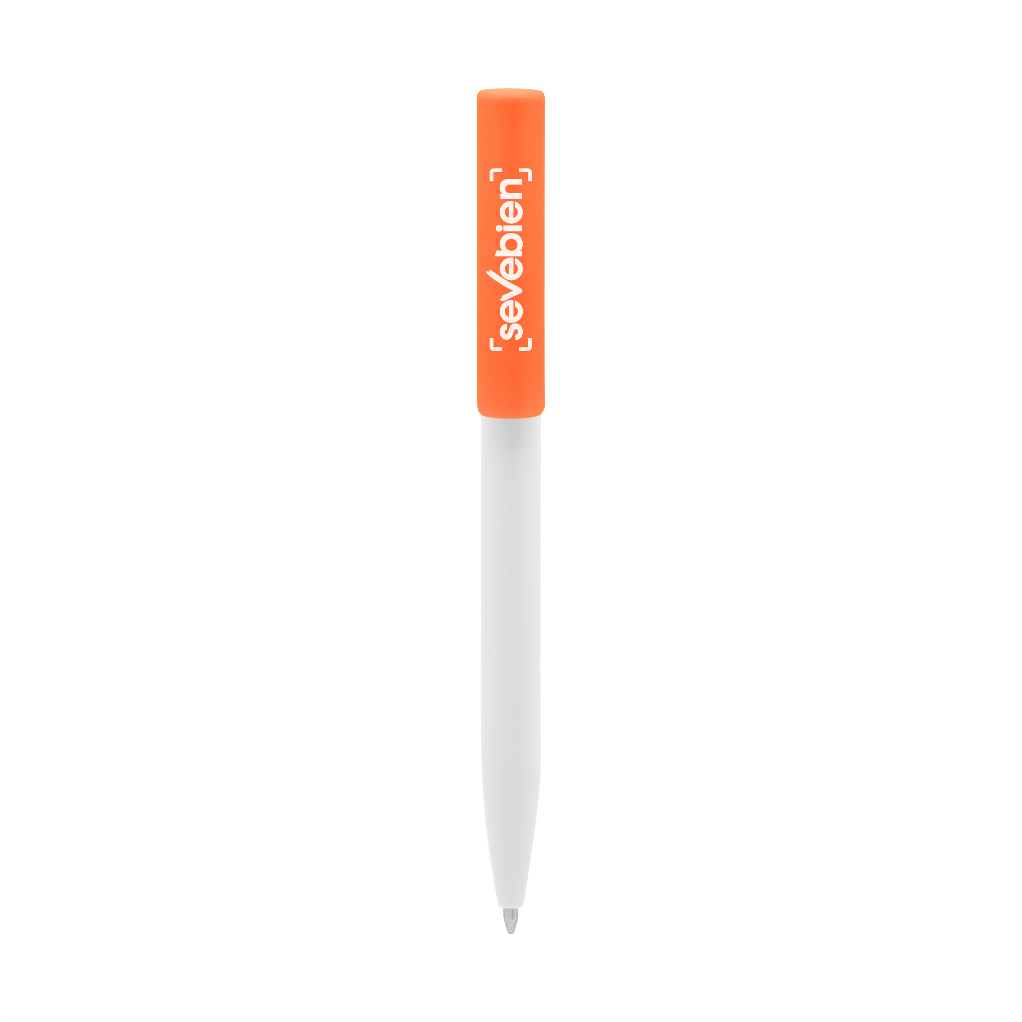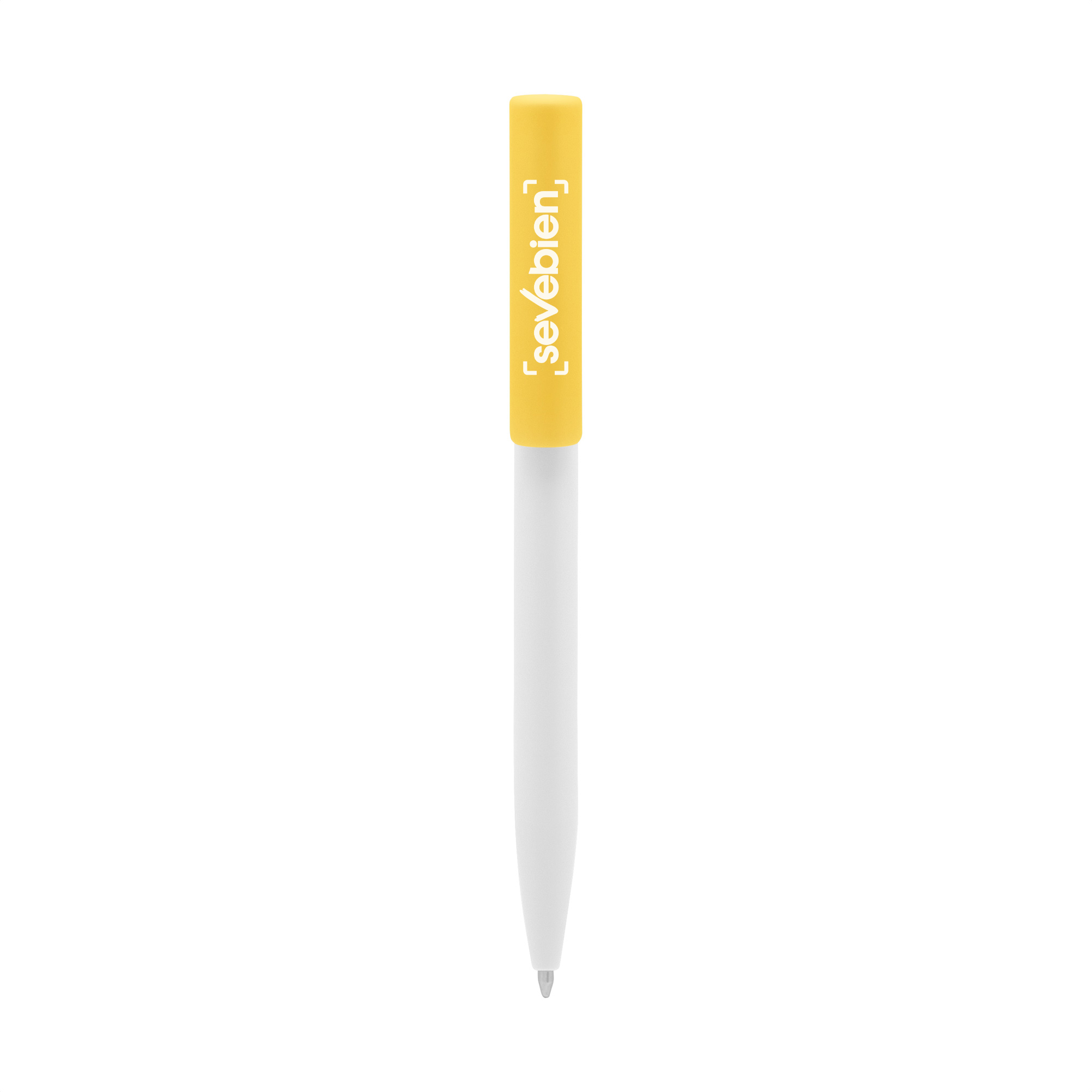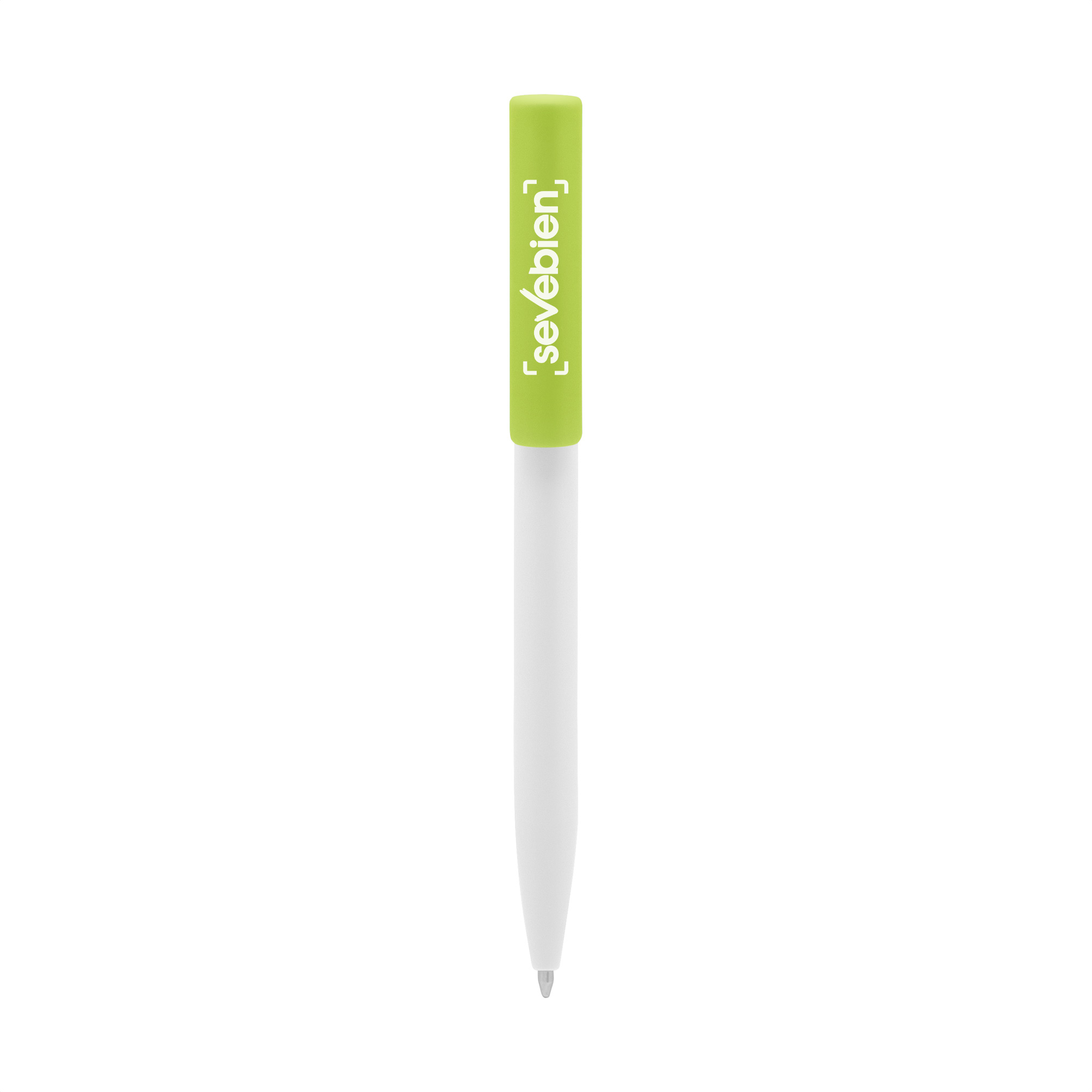 Plástico. Cuerpo blanco y clip de diferentes colores. Bolígrafo retráctil. Clip plástico de colores. Tinta negra. Sistema de botón push para destapar. Amplia área de impresión.
