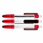 Bolígrafo plástico modelo «Flag», con cuerpo plateado y terminales de color metalizado. Incluye bandera retráctil de tela (para impresión), puntero «Touch-Screen» y clip gamuzado negro para limpiar pantalla táctil. Escritura azul.