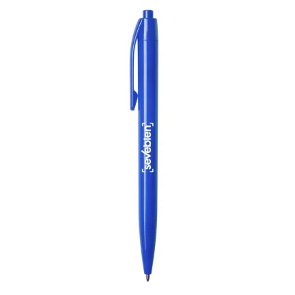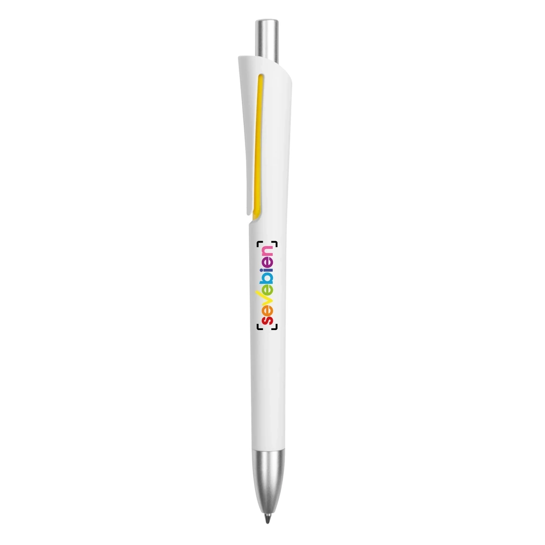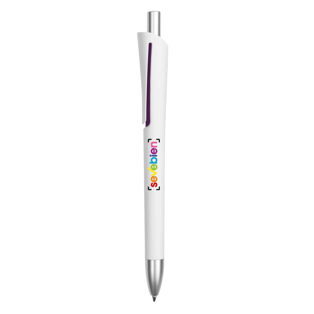 Plástico. Cuerpo blanco mate. Clip, punta y pulsador color plata. Debajo del clip detalle de color. Tinta azul.