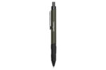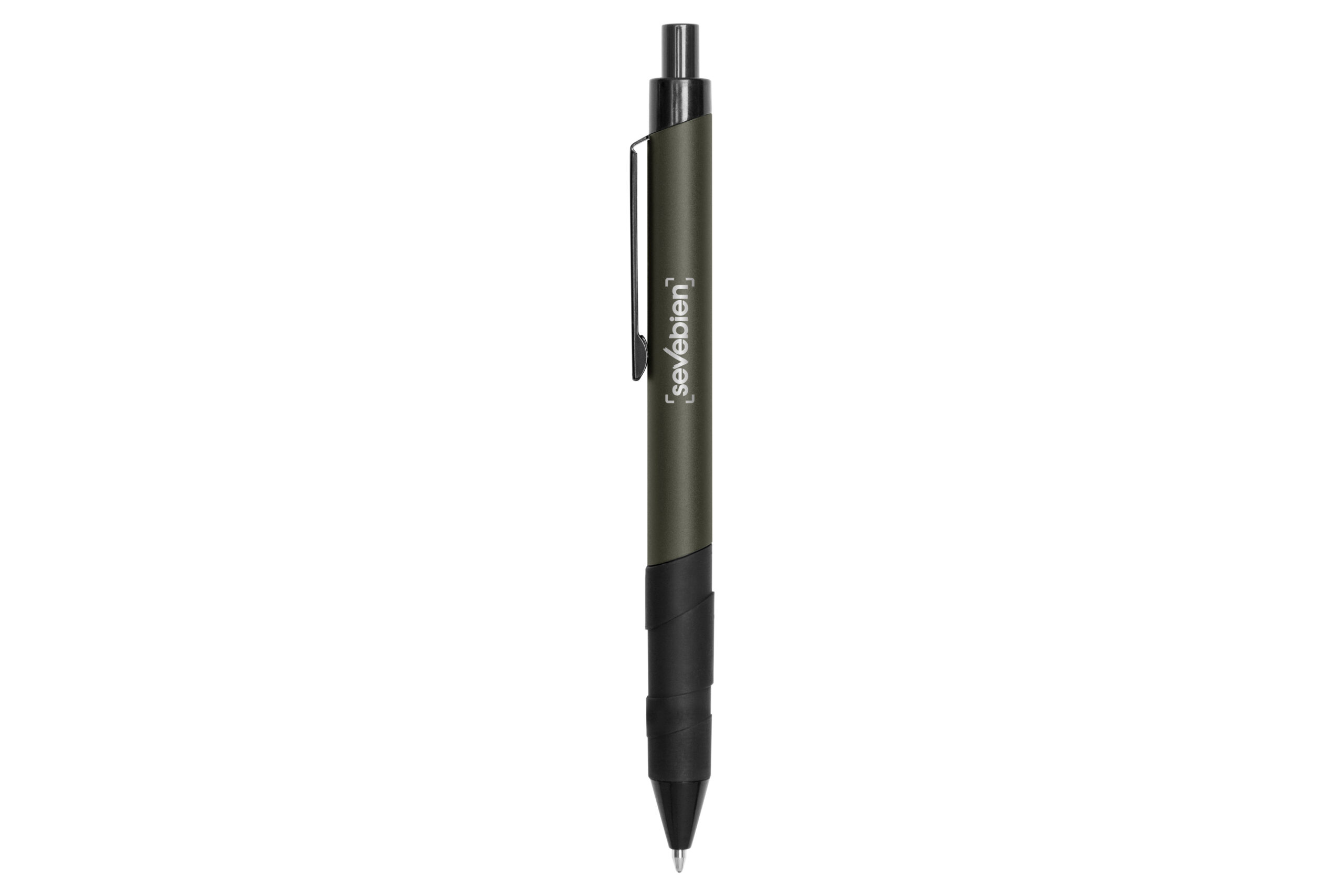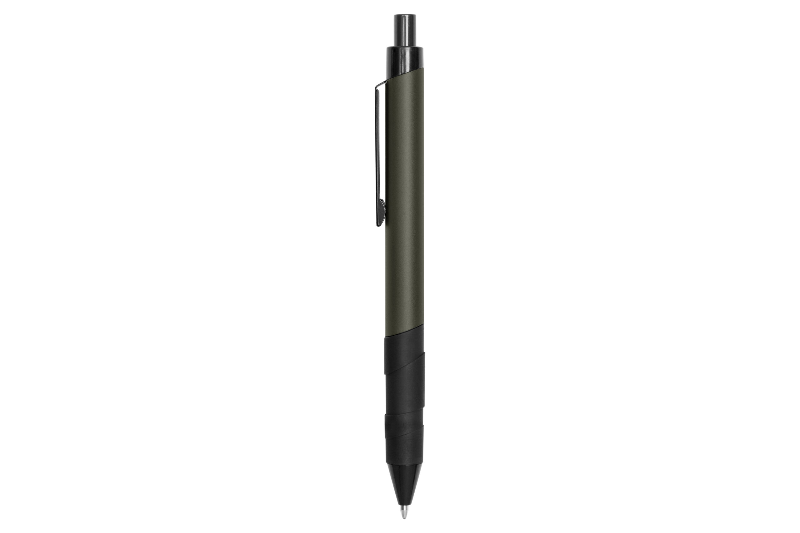 Metálico. Pulsador y puntera de plástico negro. Clip metálico en color negro. Grip de goma negro. Cuerpo de color. Tinta negra.
