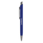 Aluminio, ABS, Acero. Boligrafo retráctil. Cuerpo revestido en laca de diferentes colores. Acabado mate. Pulsador, clip y puntera de color gris gun metal. Tinta azul. Amplia área de impresión.