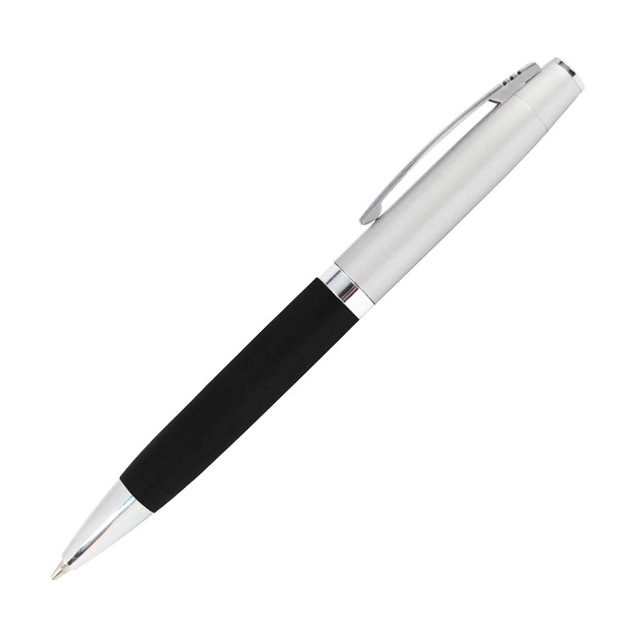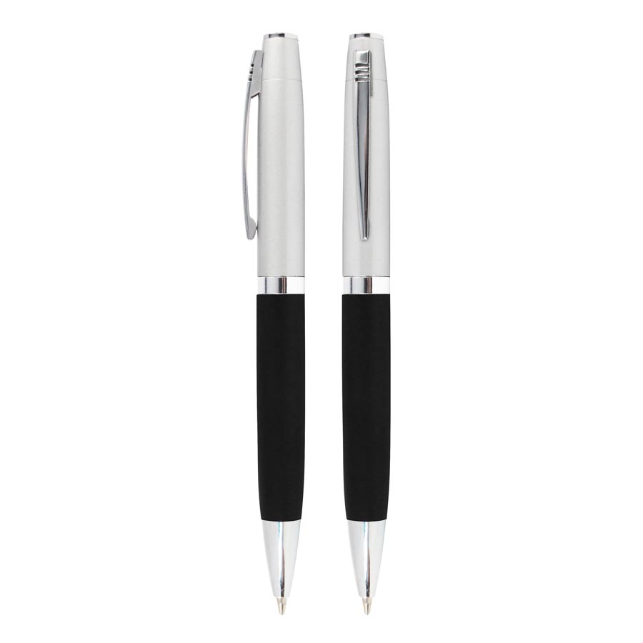 Bolígrafo Metálico bicolor modelo «Chairman». Cuerpo inferior superficie engomada negra, cuerpo superior plata satinado, terminales cromados. Escritura negra.