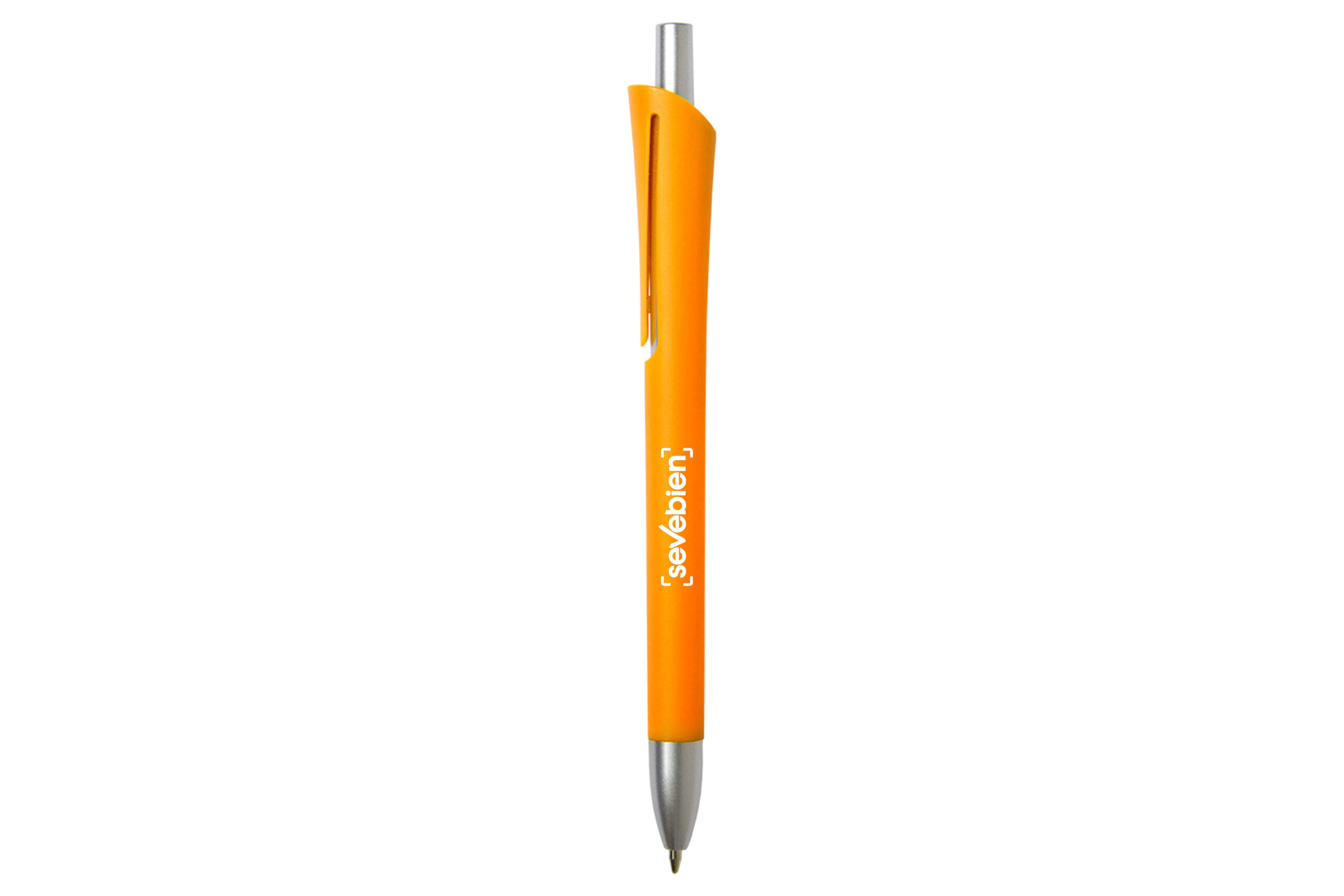 Plástico. Bolígrafo con cuerpo plástico de color, botón pulsador y puntera color plata. Tinta negra