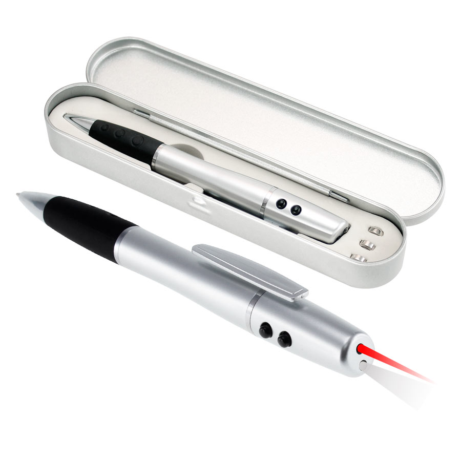 Bolígrafo plástico multi-función 3 en 1. Incluye bolígrafo, linterna LED y puntero láser. Escritura negra. Presentación en estuche metálico y caja plateada de cartón.