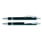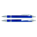 Bolígrafo plástico «Arco» con cuerpo de color metalizado. Escritura azul.