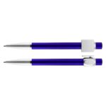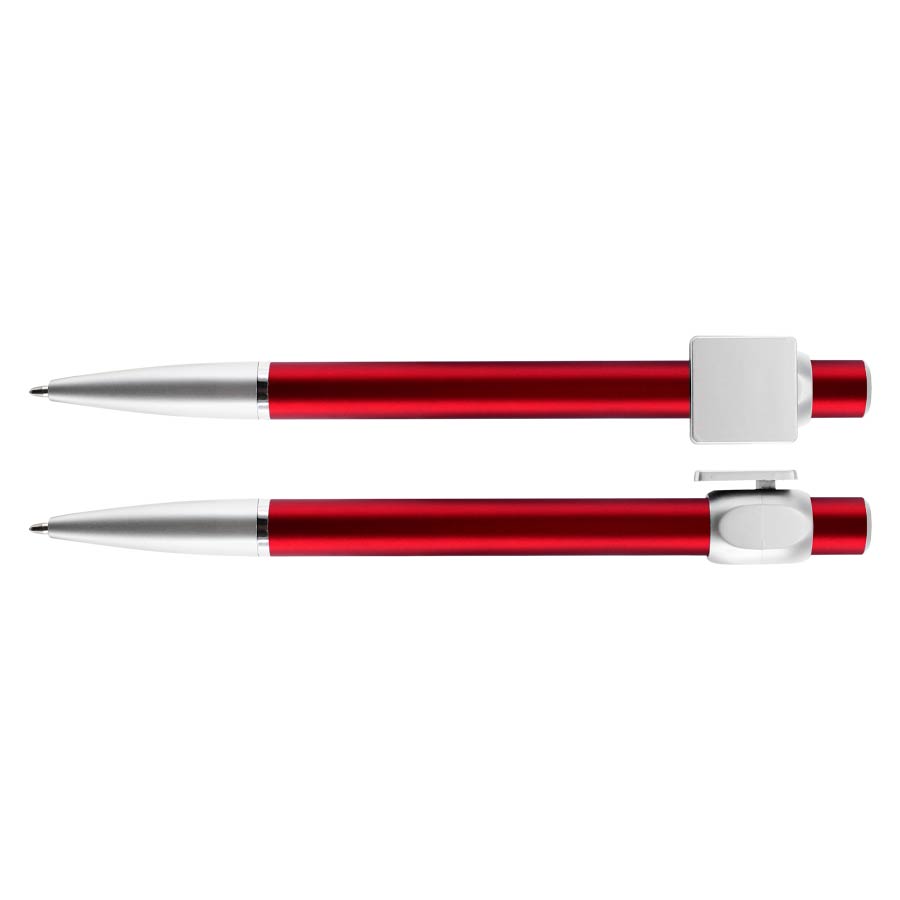 Bolígrafo «Badge» con cuerpo de color metalizado y clip cuadrado plateado, ideal para imprimir isotipos. Escritura azul.