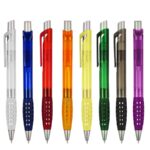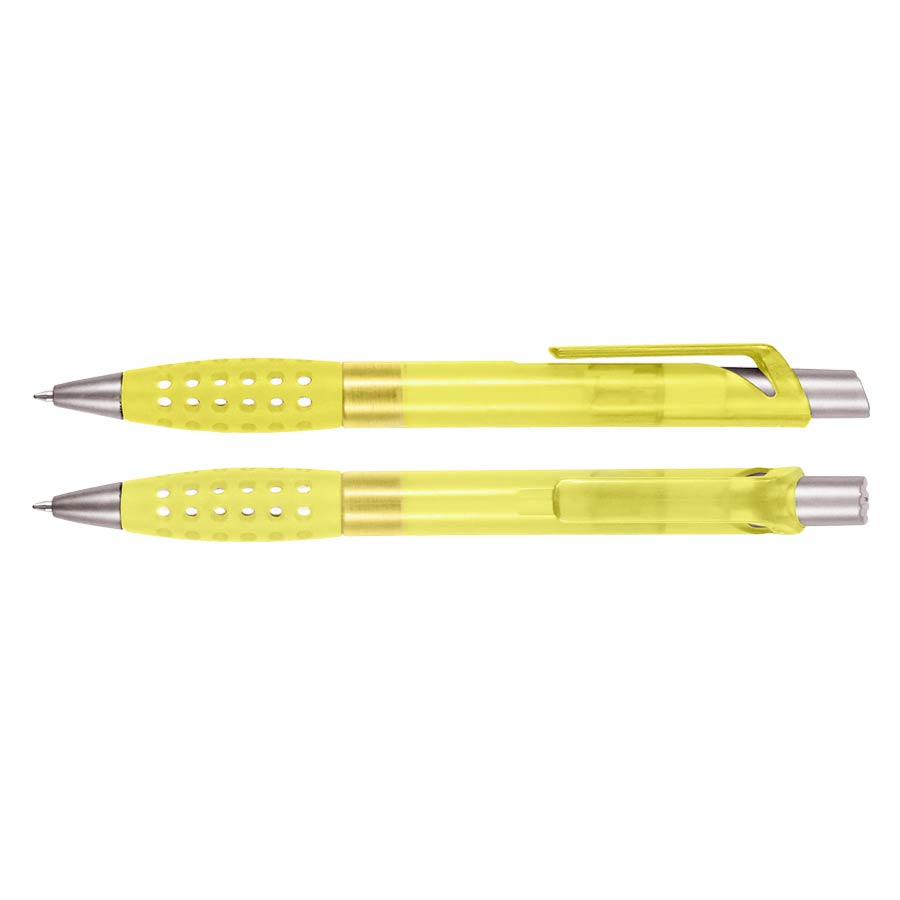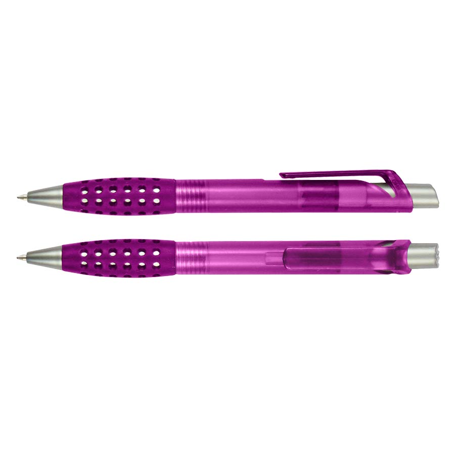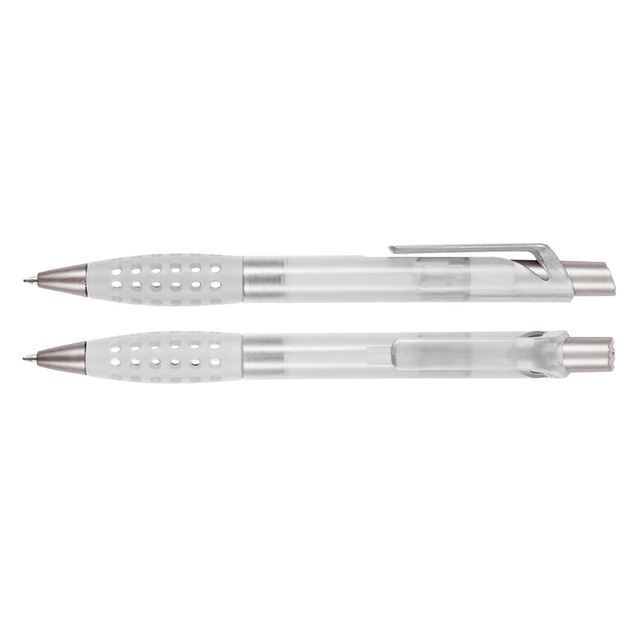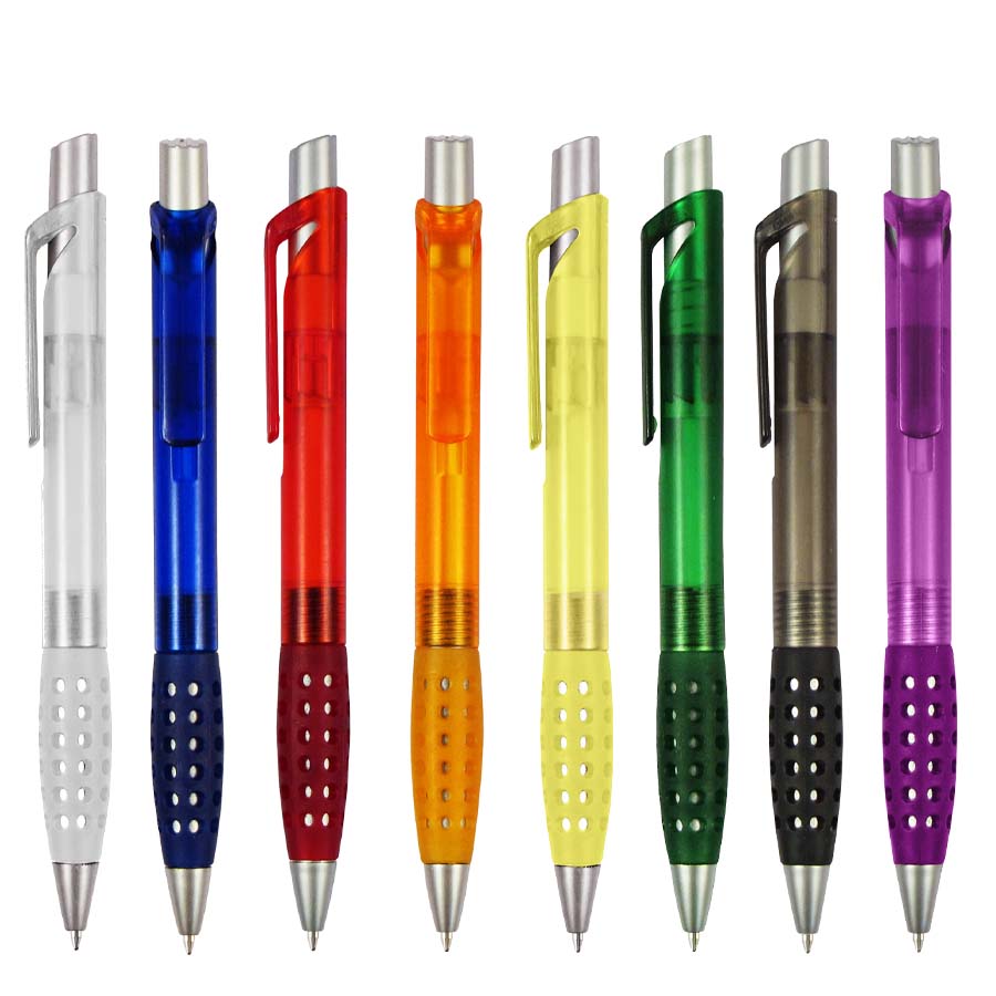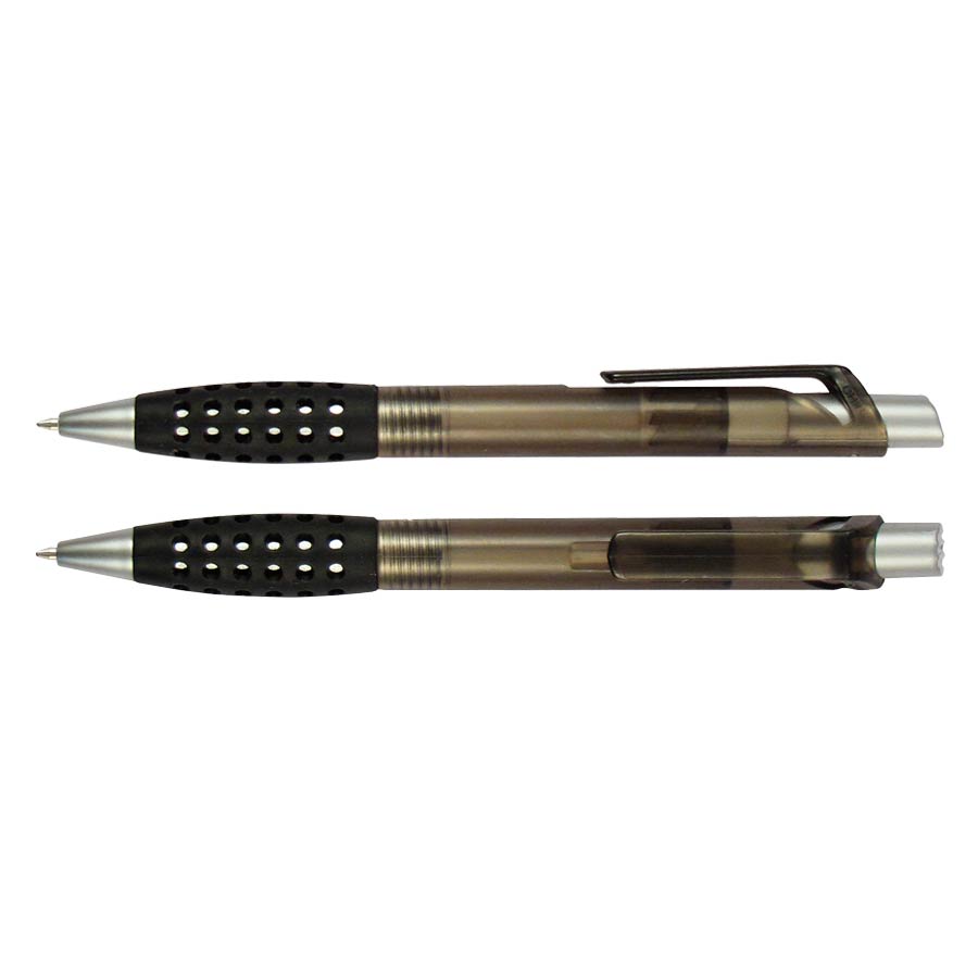 Bolígrafo plástico modelo «Punch» con grip de goma con orificios. Escritura azul.
