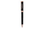 Metálico. Bolígrafo con apertura giratoria. Destape cobre en la parte de arriba. Cuerpo negro. Detalles en clip, arco circular y punta color cobre. Tinta negra.  Presentación en estuche con cierre magnético.