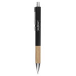 Metal. Cuerpo de aluminio en diferentes colores. Grip de bambú. Clip metálico. Pulsador y puntera plásticas color plata. Tinta negra. Decape color plata.