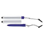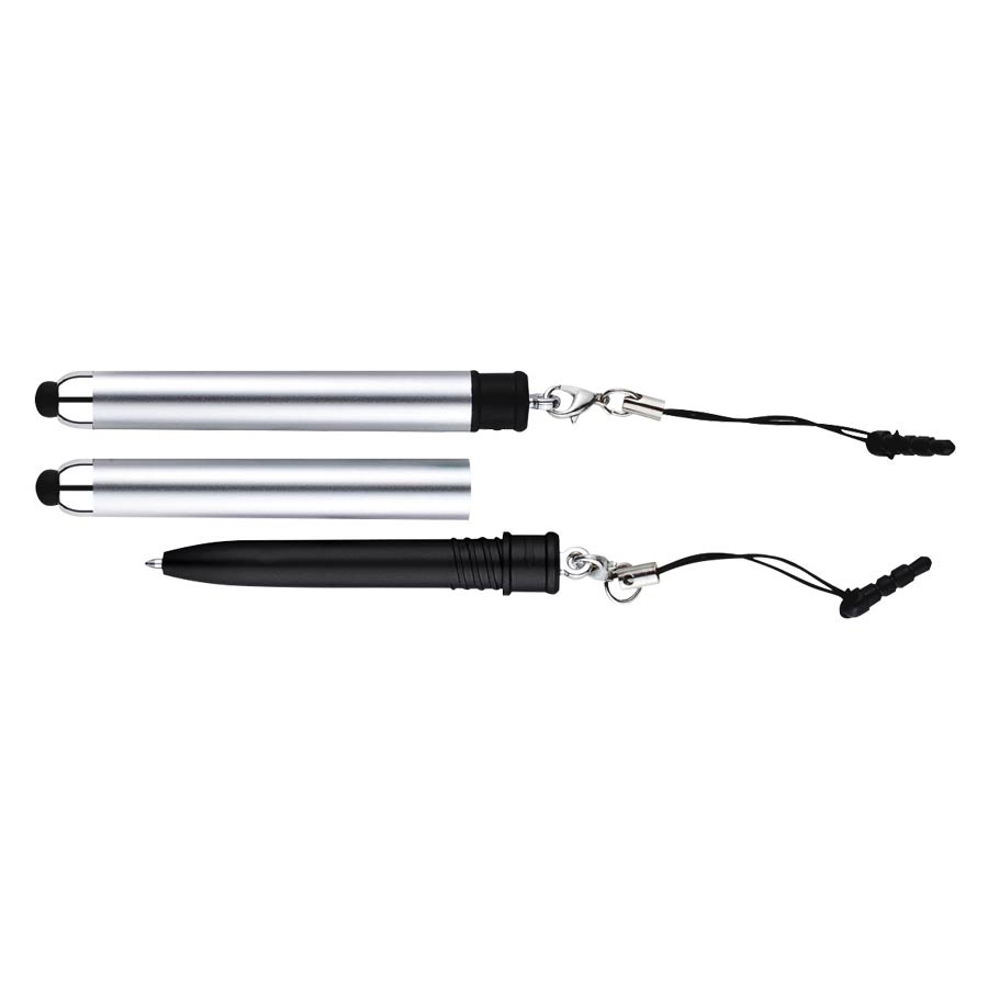 Bolígrafo «Touch-Screen» con tapa plateada y goma posterior negra para pantalla táctil. Incluye práctico soporte plástico para insertar en la salida de auricular del iPhone. Escritura azul.