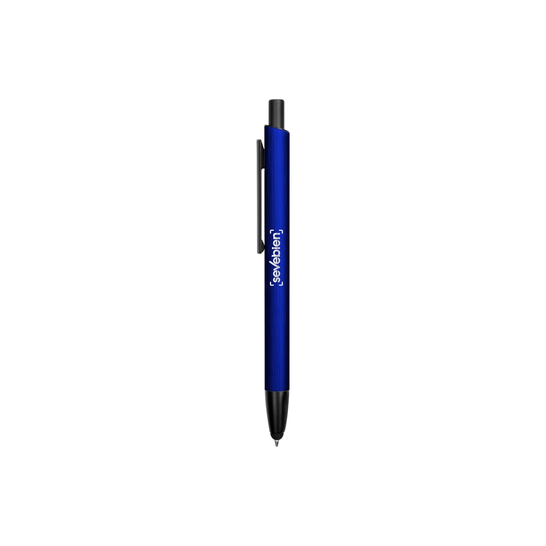 Aluminio. Cuerpo metálico. Clip, punta y pulsador plásticos. Punta touch. Tinta azul.
