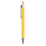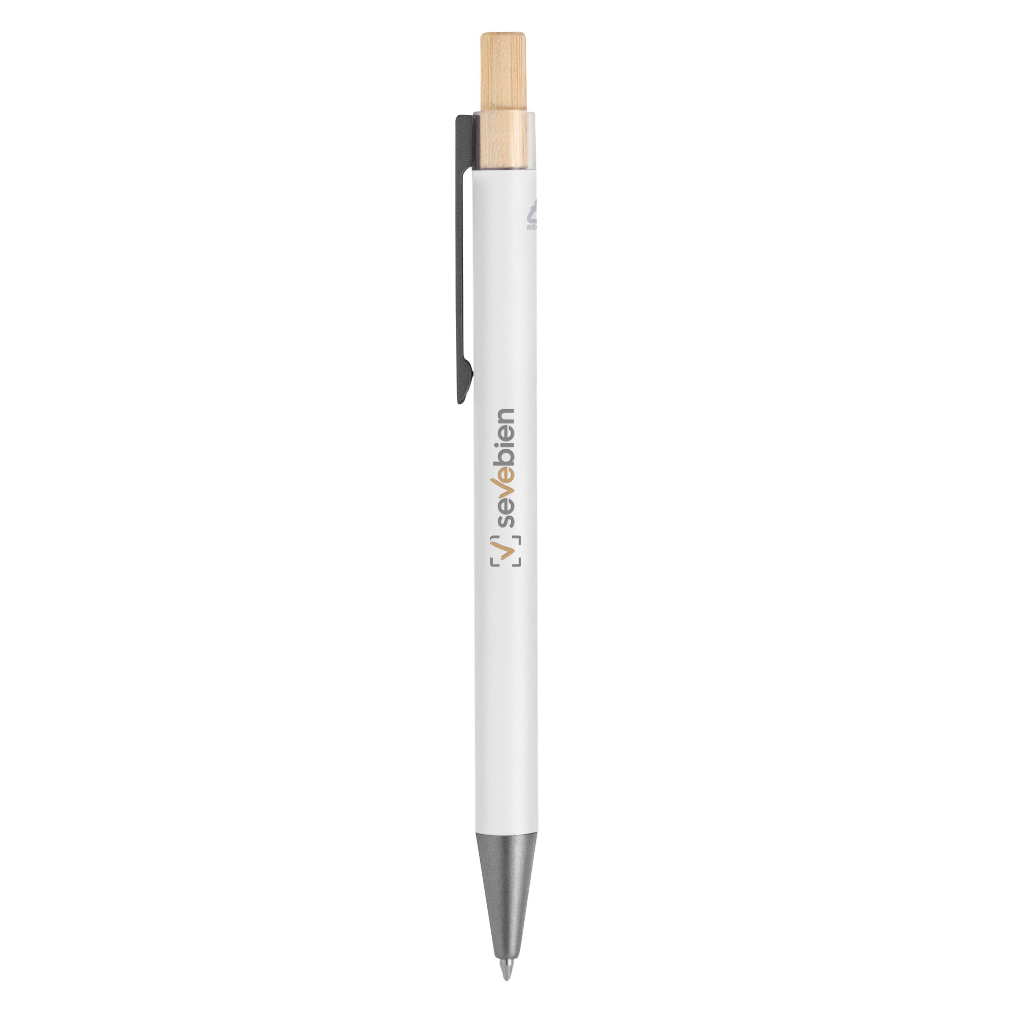 Elegancia y sostenibilidad. Bolígrafo retráctil. Cuerpo metálico en diferentes colores acabado mate. Clip metálico y puntera plástica color gris acabado mate. Pulsador de bambú.Medidas: 14 cm.