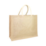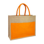 Bolso grande de Yute natural con amplio bolsillo delantero de Canvas 100% Algodón natural de 250g/m2 (9 onzas). Cuenta con 2 asas de algodón natural relleno de 40 cm. c/u aprox.