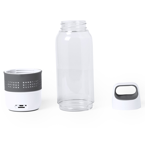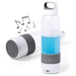 Bidón de 500ml de capacidad con altavoz bluetooth integrado en base. Cuerpo acabado en material tritán de resistencia al calor (70º) y libre de BPA en color transparente, con tapón de seguridad a rosca y asa integrada. Base altavoz de conexión bluetooth de 3W de potencia con función de manos libres y ranura para tarjetas micro SD de hasta 32 GB de capacidad. Compatible con iOS y Android, incluye cable de carga mini USB, tiene base antideslizante y viene presentado en atractiva caja de diseño. 500 ml. Conexión Bluetooth. Potencia 3W. Recargable USB. Presentación Individual. Cable Incluido