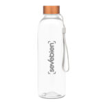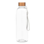 Ø 7 x 23 cm. Capacidad 700 ml. Peso de la botella 70 g y de la tapa 15g. Material PET Cristalino. Botella de plástico transparente con tapa a rosca de acero inoxidable, anillo de silicona antiderrame y correa para transportar. ATENCIÓN Botella y tapa se entregan por separado. / No utilizar con bebidas gaseosas ni líquidos calientes. / El manejo de este producto es delicado. / No exponer al sol y temperaturas altas por tiempo prolongado.