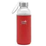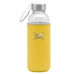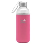 Ø 5,5 x 19,5 cm. Capacidad 440 ml. Vidrio. Cuerpo traslúcido. Funda de neopreno para proteger la botella y mantener la temperatura de las bebidas. Tapa de acero inoxidable con tira de tela. Botella apta para microondas y lavavajillas. Tapa y funda no pueden ser expuestos a estos electrodomésticos. Presentación en caja de regalo.