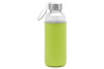 Ø 5,5 x 19,5 cm. Capacidad 440 ml. Vidrio. Cuerpo traslúcido. Funda de neopreno para proteger la botella y mantener la temperatura de las bebidas. Tapa de acero inoxidable con tira de tela. Botella apta para microondas y lavavajillas. Tapa y funda no pueden ser expuestos a estos electrodomésticos. Presentación en caja de regalo.