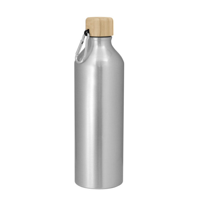 Estilo y ecología en una botella.Botella de aluminio. Tapa a rosca de bambu con anillo de silicona y con mosquetón (gancho carabinero) en color plateado.Medidas: Ø 7,2 x 25,5 cm.