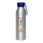 Ø 6,6 x 23 cm. Capacidad 600 ml. Aluminio. Cuerpo color plata, tapa de color traslucida con tira de silicona (de 8 cm) del mismo color. Ideal para hiodratarte todos los días. Presentación en caja de regalo.