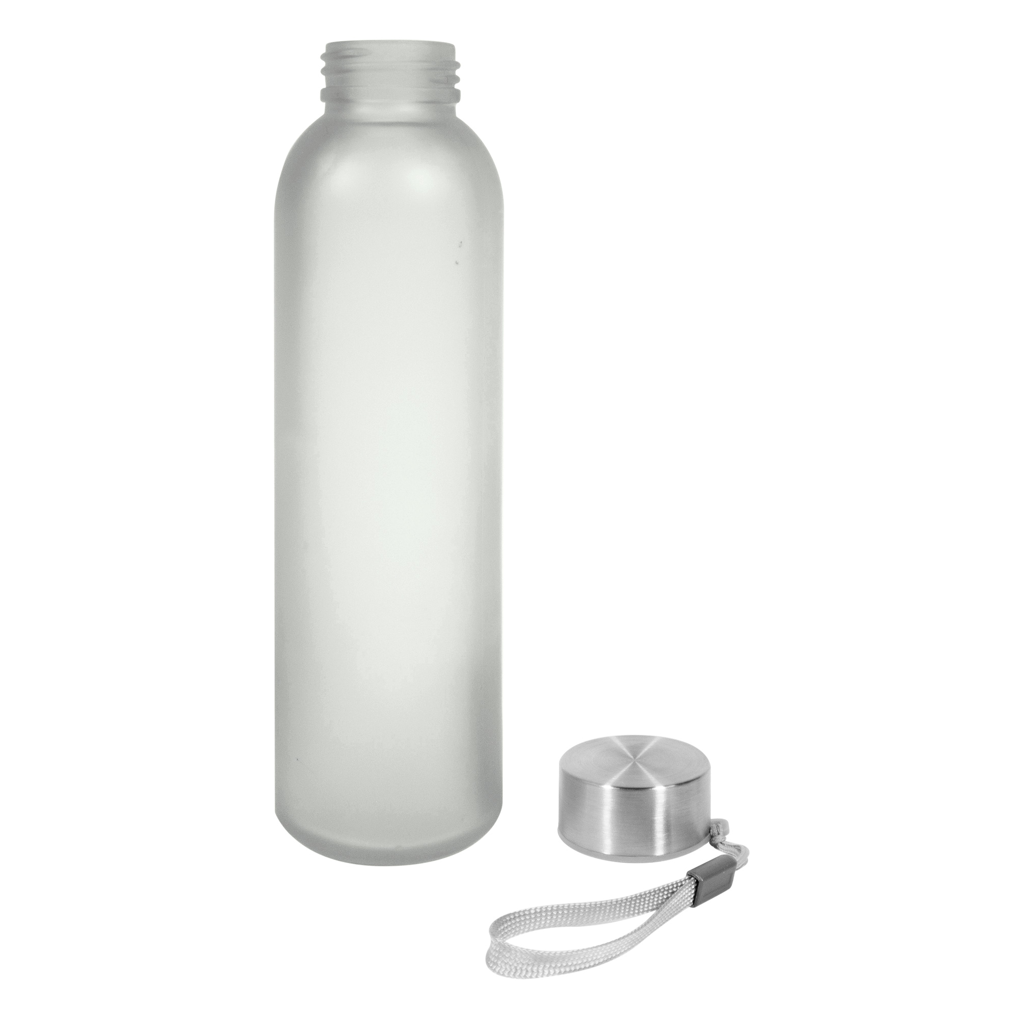 Ø 6,2 x 23 cm. Capacidad 500 ml. Vidrio. Botella de vidrio con acabado frosty. Tapa de acero inoxidable, aro de silicona antiderrame y correa de tela reforzada. Presentación en caja de regalo.