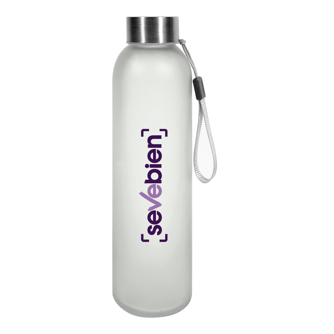 Ø 6,2 x 23 cm. Capacidad 500 ml. Vidrio. Botella de vidrio con acabado frosty. Tapa de acero inoxidable, aro de silicona antiderrame y correa de tela reforzada. Presentación en caja de regalo.