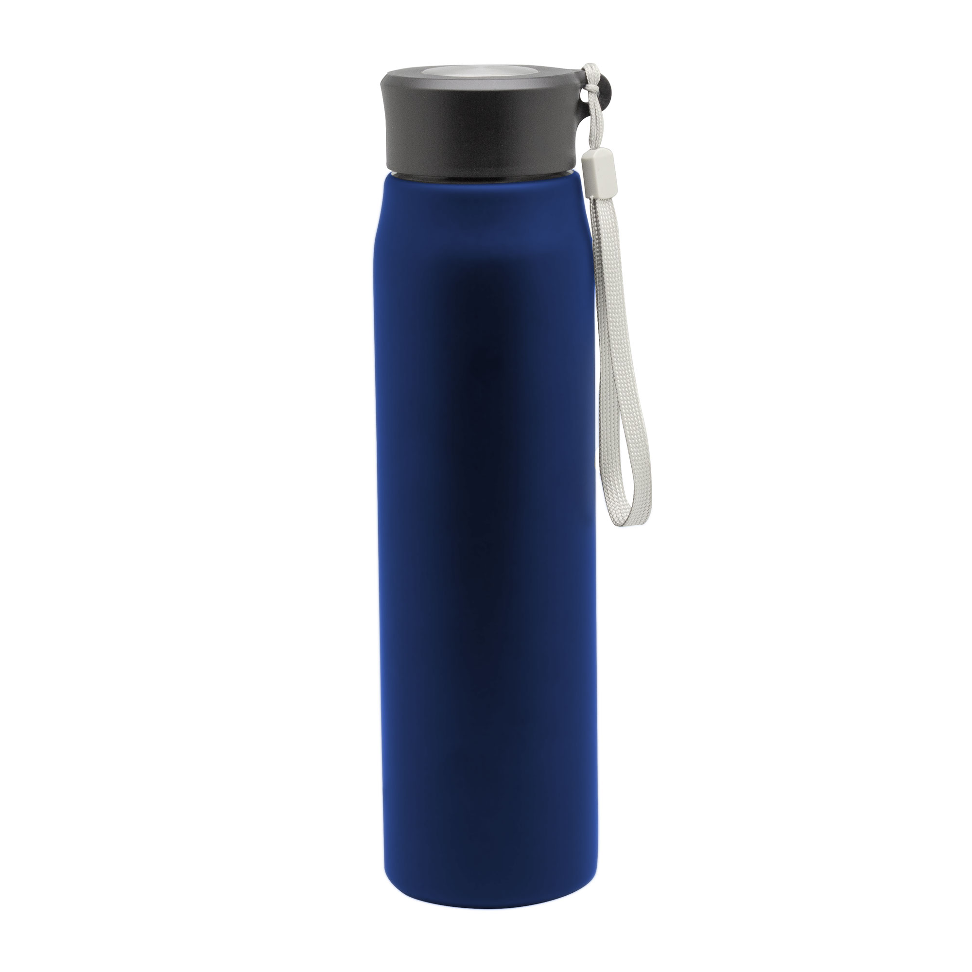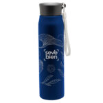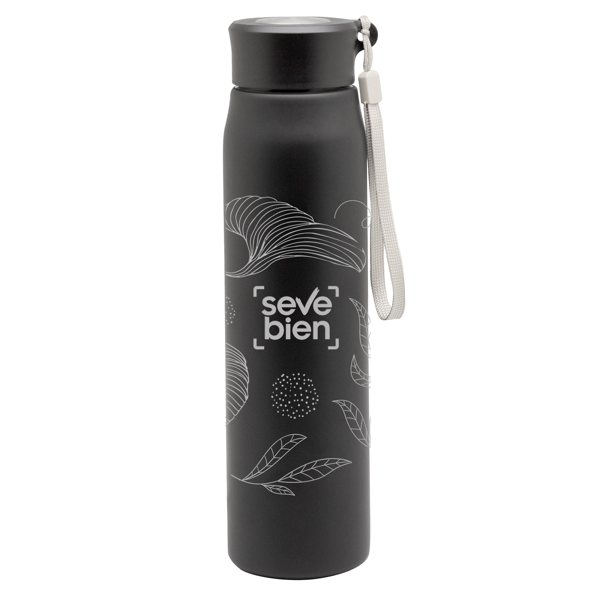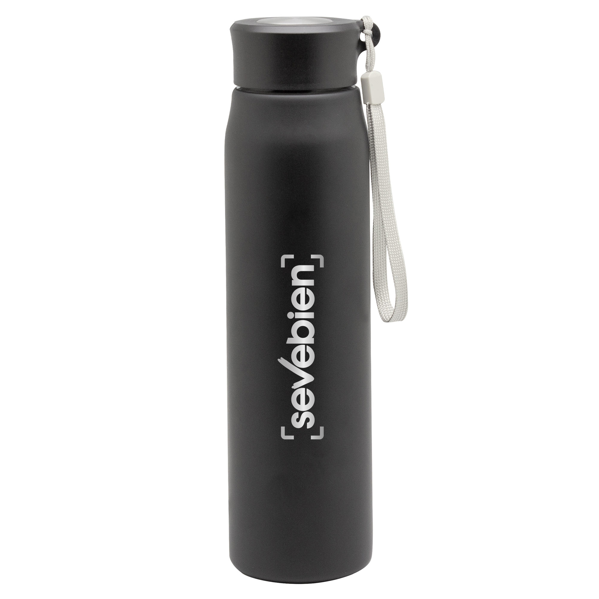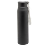 Ø 6,5 x 25 cm. Capacidad 800ml. Acero inoxidable. Botella de acero inoxidable 304. Tapa combinada en plástico y acero inoxidable 201 con tira de color gris de 12 cm de largo. Ideal para llevarla a todos lados. Presentación en caja de regalo.