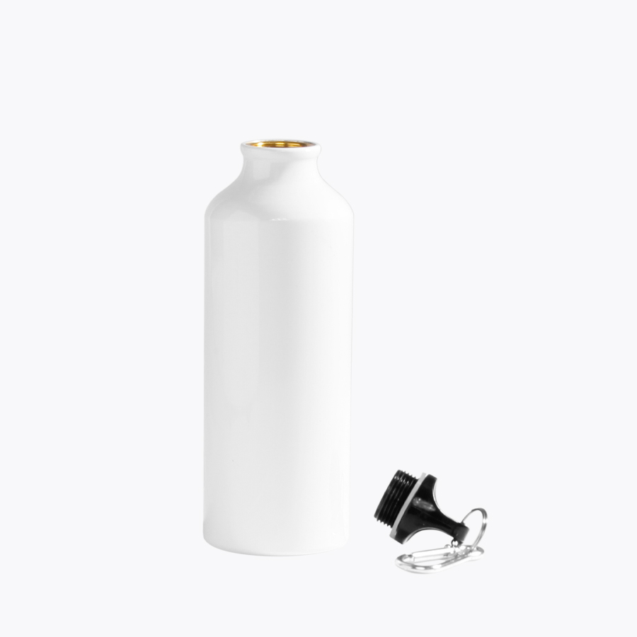 Botella blanca de Aluminio de 500cc. con cobertura para Sublimación. Incluye tapa rosca plástica y mosquetón metálico plateado.
