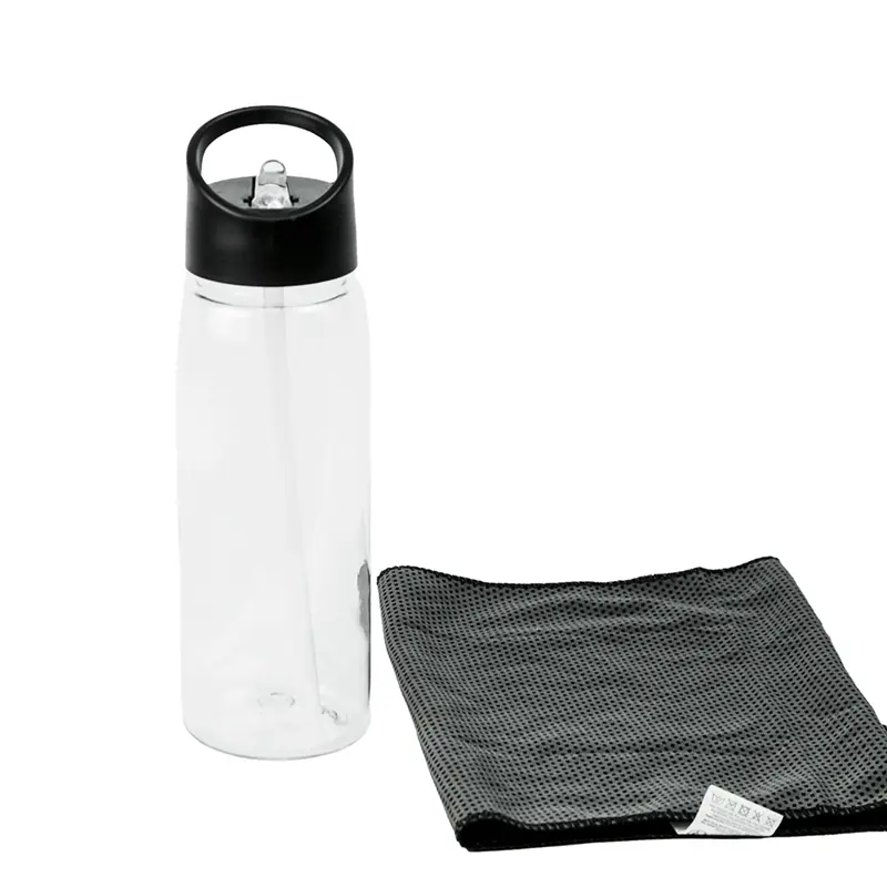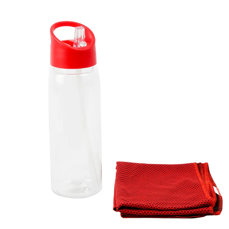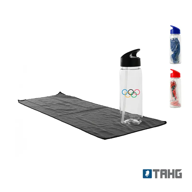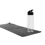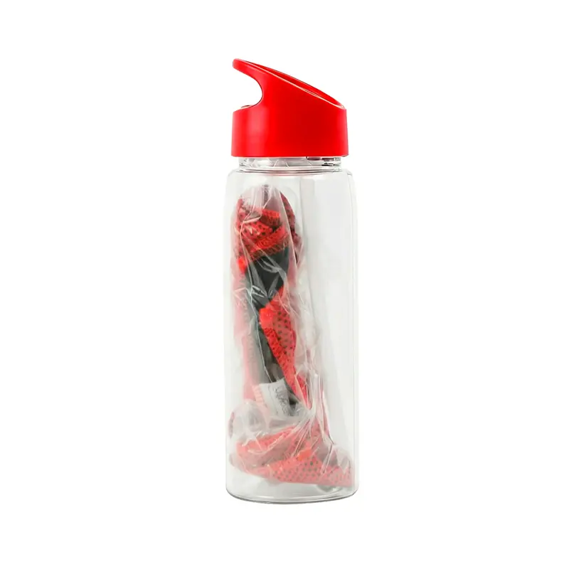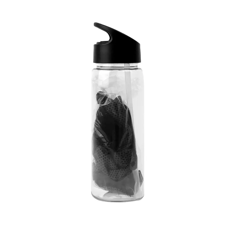 Botella deportiva fabricada en RPET con tapa de polipropileno. Cuenta con una toalla de poliéster, tapa con sorbete y anillo para mejor agarre. Es ideal para entrenamientos, actividades al aire libre o jornadas deportivas intensas