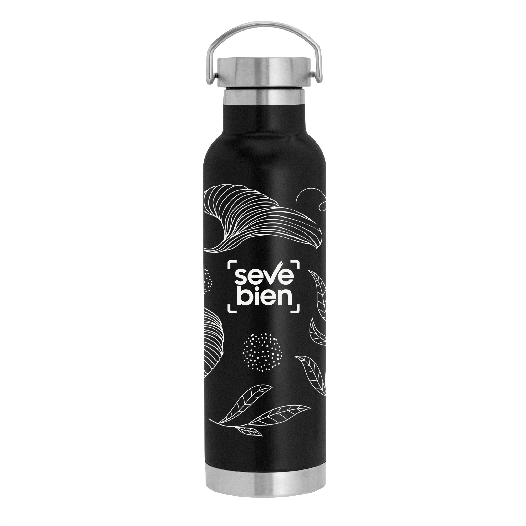 Ø 7,3 x 26 cm. Capacidad 650 ml. Acero inoxidable. Botella doble pared, sellada al vacío. Interior en acero 304 y exterior en acero 201. Tapa de acero a rosca con manija rebatible metálica . La medida de este termo es tan practica que con el tendras el liquido necesario para estar hidratado en el momento del día que elijas. Mantiene hasta 12 hs la temperatura de las bebidas calientes y 24 hs de las bebidas frías. Presentación en caja de regalo.