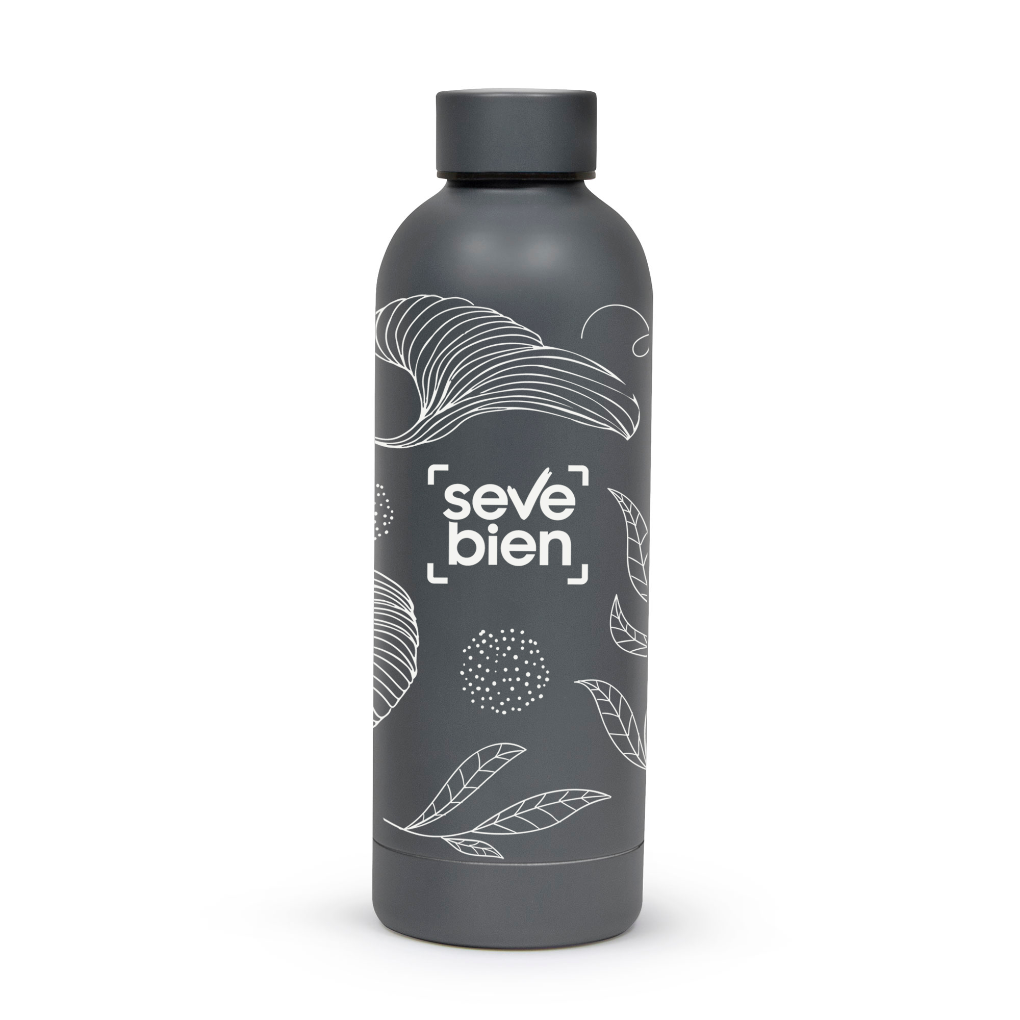 Ø 7.4 x 22 cm. Capacidad 500 ml. Acero inoxidable. Botella doble pared, sellada al vacío. Interior en acero 304 y exterior en acero 201. Mantiene hasta 12 hs la temperatura de las bebidas calientes y 24 hs de las bebidas frías. Presentación en caja de regalo.