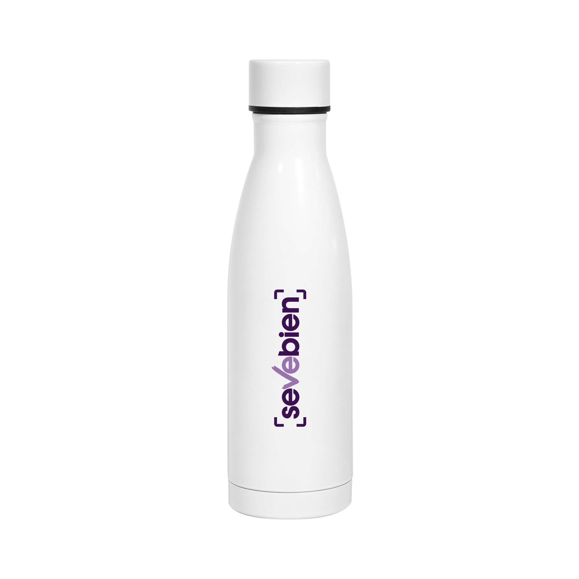 Ø 7 x 25,5 cm. Capacidad 500 ml. Acero inoxidable. Botella doble pared, sellada al vacío. Interior de acero 304 y exterior de acero 201. Cuerpo y tapa a rosca del mismo color. Mantiene hasta 12 hs la temperatura de las bebidas calientes y 24 hs de las bebidas frías. Presentación en caja de regalo.