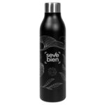 Ø 6,6 x 24,5 cm. Capacidad 500 ml. Acero inoxidable. Botella doble pared, sellada al vacío con recubrimiento de cobre. Interior de acero 304 y exterior de acero 201. Pintura color negro mate. Tapa de acero a rosca. Mantiene por más de 12 hs la temperatura de las bebidas calientes y 24 hs de las bebidas frías. Presentación en caja de regalo.