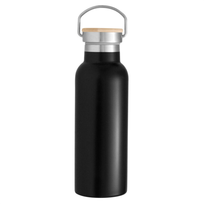 Ø 7,2 x 22,3 cm. Capacidad 550 ml. Acero inoxidable. Botella térmica doble pared sellada al vacío. Interior en acero 304 y exterior en acero 201. Tapa de acero inoxidable con manija metálica rebatible y detalles en bambú. Anillo de silicona antiderrame. Mantiene hasta 12 hs la temperatura de las bebidas calientes y 24 hs de las bebidas frías. Presentación en caja de regalo Kraft.
