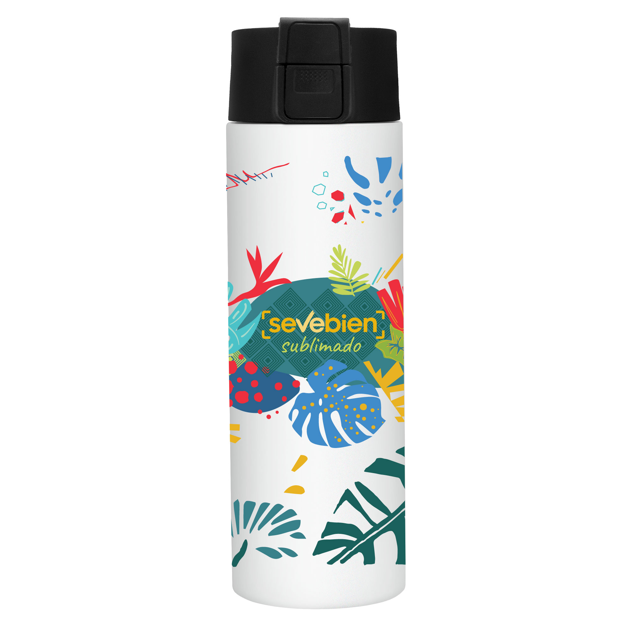 Ø 7 cm x 23 cm. Acero inoxidable. Capacidad 450 ml. Botella doble pared, sellada al vacío. Interior de acero 304 y exterior de acero 201. Pintura color blanco brillante apta para sublimado. Tapa en PP con traba de seguridad y botón pulsador de apertura. Mantiene por más de 12 hs la temperatura de las bebidas calientes y 24 hs de las bebidas frías. Presentación en caja de regalo kraft.