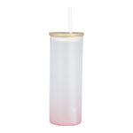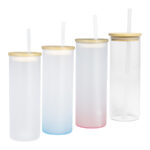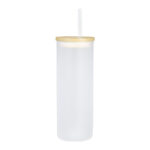 Botella de Vidrio Borosilicato para Sublimación, para líquidos fríos, con tapa de Bamboo y bombilla plástica empavonada. Capacidad 500cc. Presentación bolsa plástica empavonada + caja de cartón blanco. Calidad Premium ORCA.