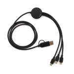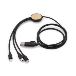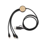 Cable 3 en 1 color negro, con una longitud de xxx. Es el accesorio perfecto para mantener tus dispositivos siempre cargados y listos para usar. Cuenta con un cable de entrada tipo C con adaptador USB A y 3 cables de salida TIPO C / MICRO B / LIGHTING, lo que te permite cargar dispositivos con diferentes tipos de entradas. También, cuenta con un accesorio redondo de bamboo de donde salen los 3 cables. ReUseMe.