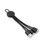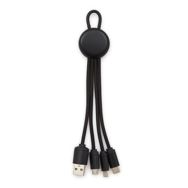 Cable 3 en 1 color negro, blanco o gris, con una longitud de 17 cm. Es el accesorio perfecto para mantener tus dispositivos siempre cargados y listos para usar. Incluye un cable de entrada USB A y 3 de salida TIPO C / LIGHTING / MICRO B, lo que te permite cargar dispositivos con diferentes tipos de entradas. Realizado en plástico reciclados: RABS y RTPE.