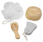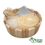 Canasto SPA de belleza en madera modelo «Naturals». Contiene cepillo de pelo, esponja malla, piedra pomez y esponja de masaje corporal.