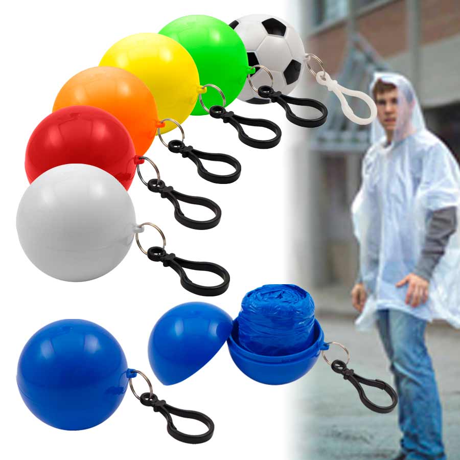 Capa de Agua (Poncho) comprimido en pelota plástica desmontable. Incluye un práctico mosquetón para colgar. Ideal para llevar adonde quieras y estar 100% preparado por si te pilla una lluvia repentina!!!