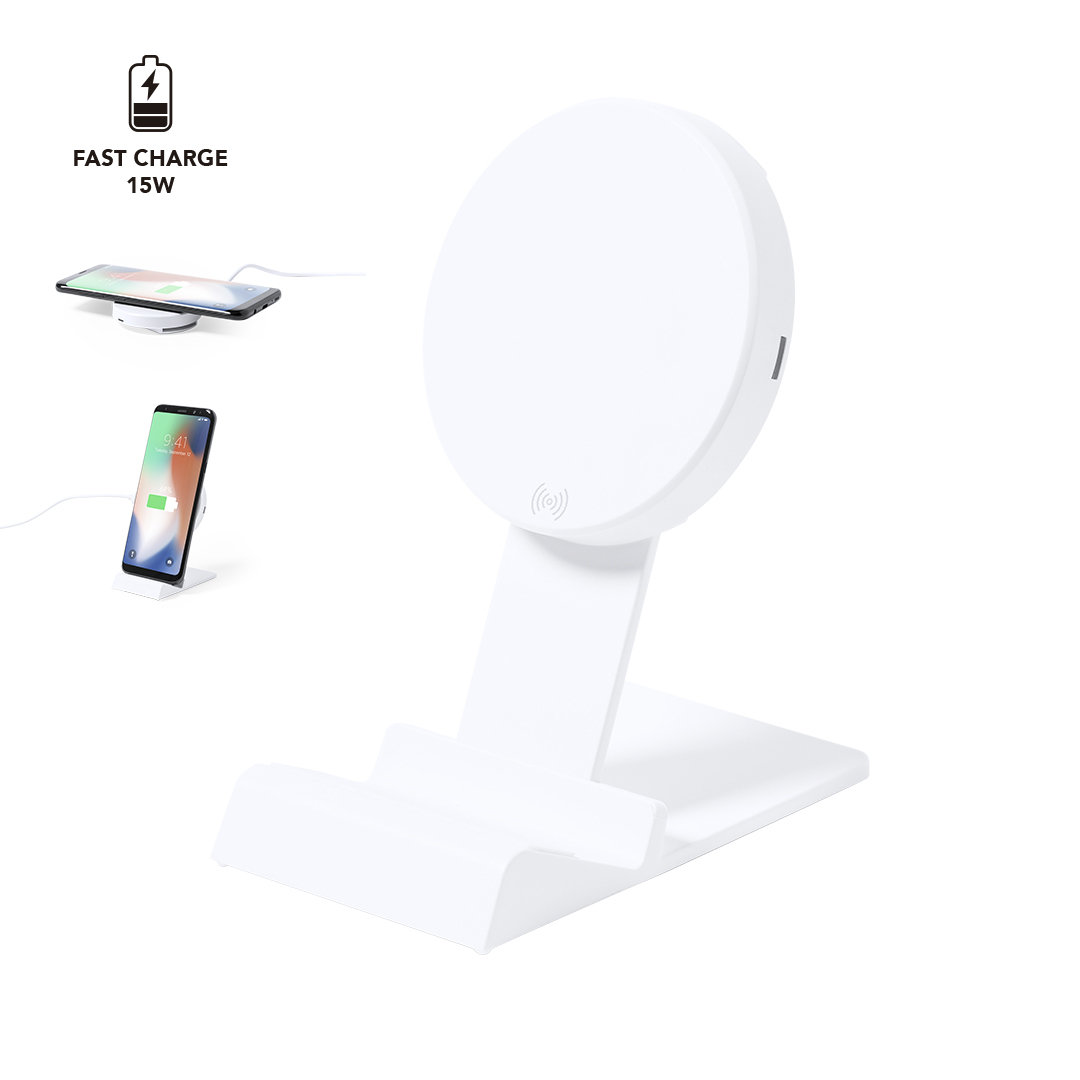 Cargador inalámbrico de carga rápida 15W. En elegante acabado blanco, con base de carga con altura regulable y función soporte para smartphone. Compatible con dispositivos equipados con tecnología de carga inalámbrica. Cable de carga Tipo C incluido, con amplia superficie de marcaje y presentado en atractiva caja de diseño. Disponible manual de instrucciones en español e inglés. En cumplimiento con los requisitos de seguridad: Sistema de protección contra sobrecalentamiento. Sistema de protección contra sobrecarga. Sistema de bloqueo para evitar cortocircuitos. Inalámbrico 15W. Altura Regulable