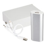 Cargador Power Bank USB metálico. Capacidad 5200mAh. Incluye cable USB + 3 adaptadores para Micro-USB, Lightning y Type-C. Batería recargable incorporada. Presentación en caja de regalo laminada blanca.