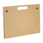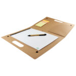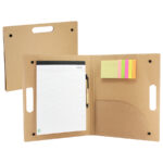 Carpeta Ecológica tipo Maletín, en cartulina reciclada, con broches. Incluye Block Lineado A4 20 hojas, 1 taco notas adhesivas de 25 hojas de 7,6 x 7,6 cm + 5 tacos de 25 banderitas adhesivas de 7,6 x 1,5 cm., bolsillo interior y 1 bolígrafo ecológico.